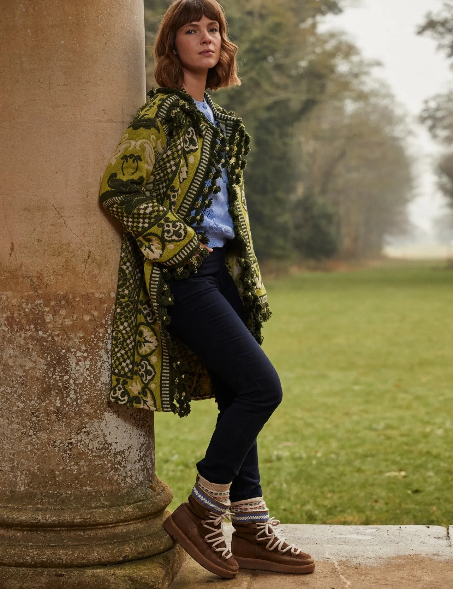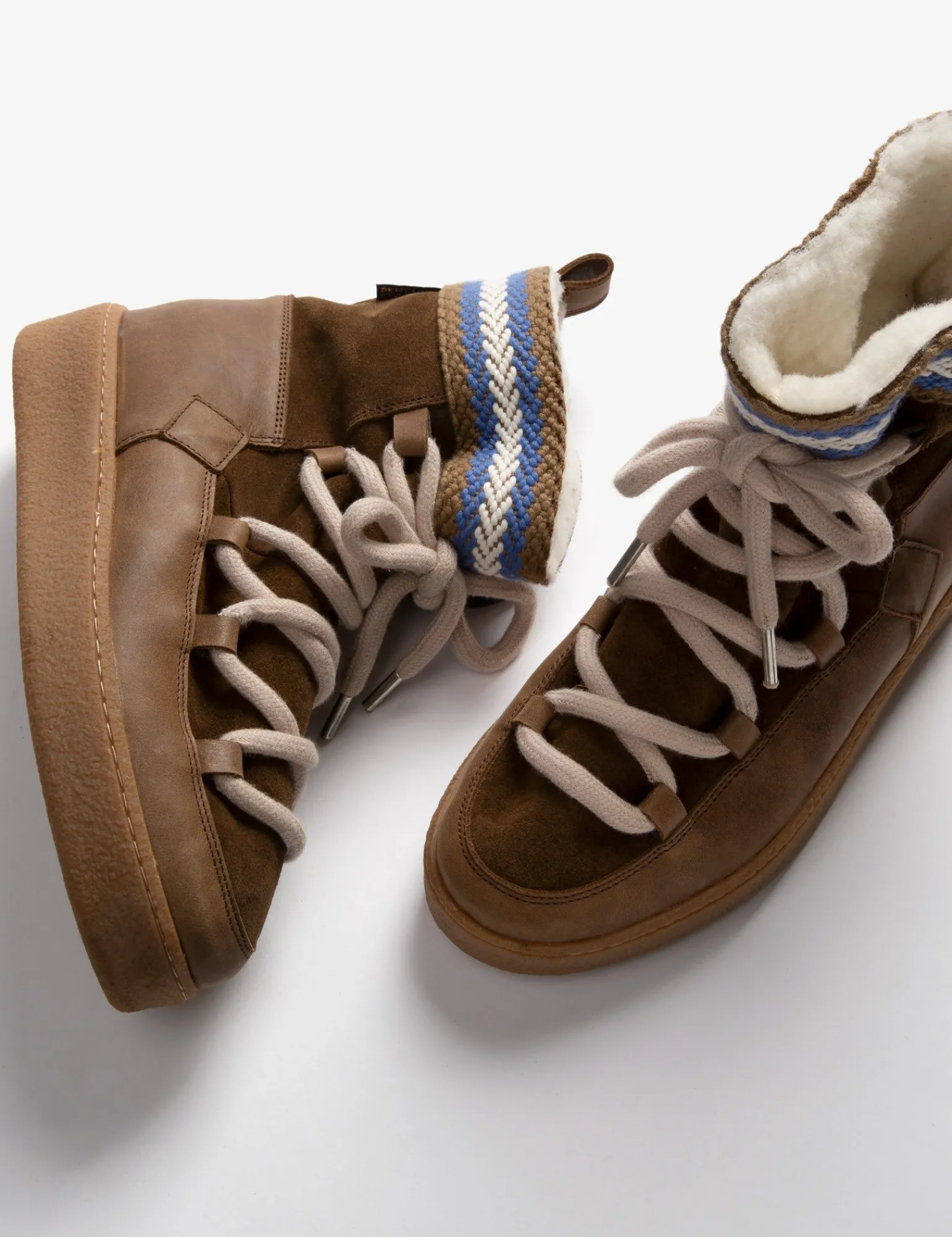 The Cosmos Boot is a luxurious snow boot for the coldest days, designed in sustainably sourced suede and leather with organic cotton stripe trim. Fully lined inside with 100% wool for superior warmth and comfort. This simple style with chunky laces is an easy pull-on, stylish, and practical for life on the go.