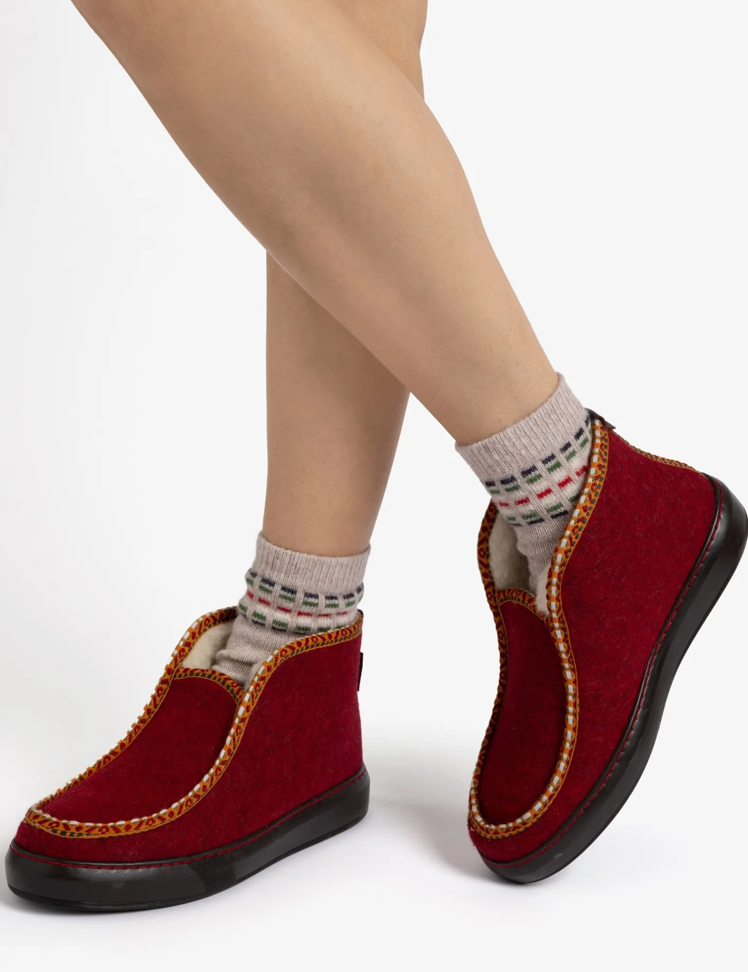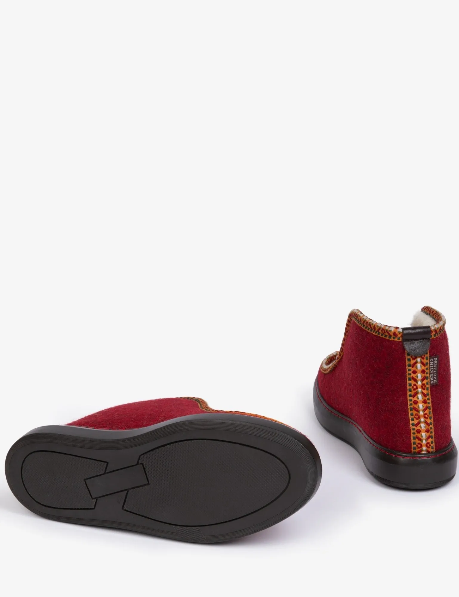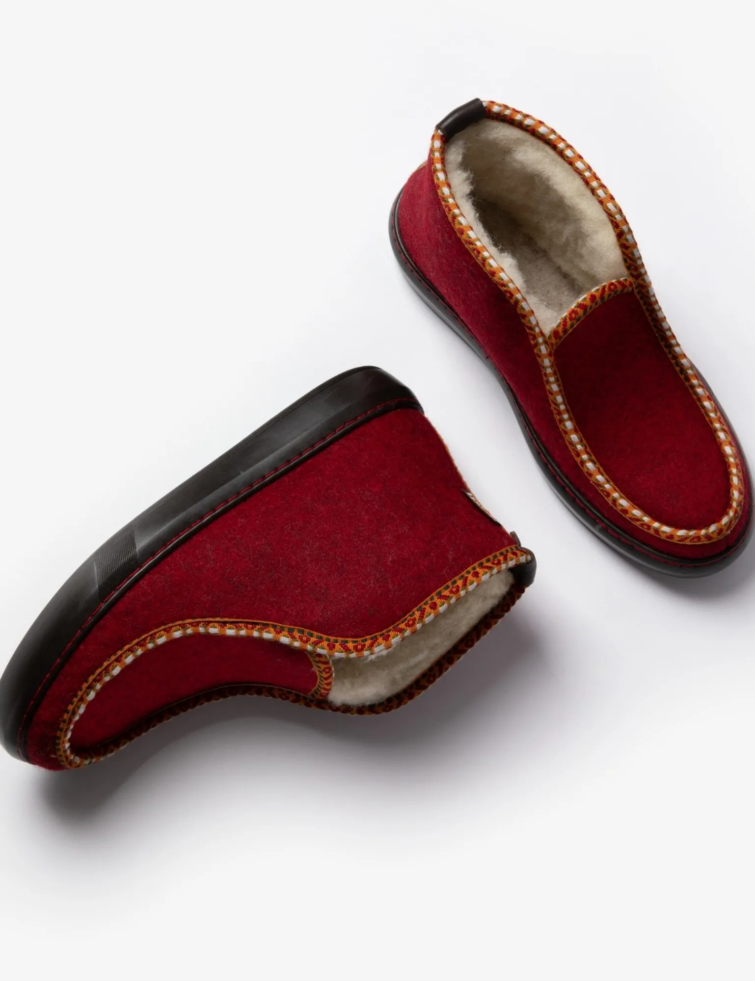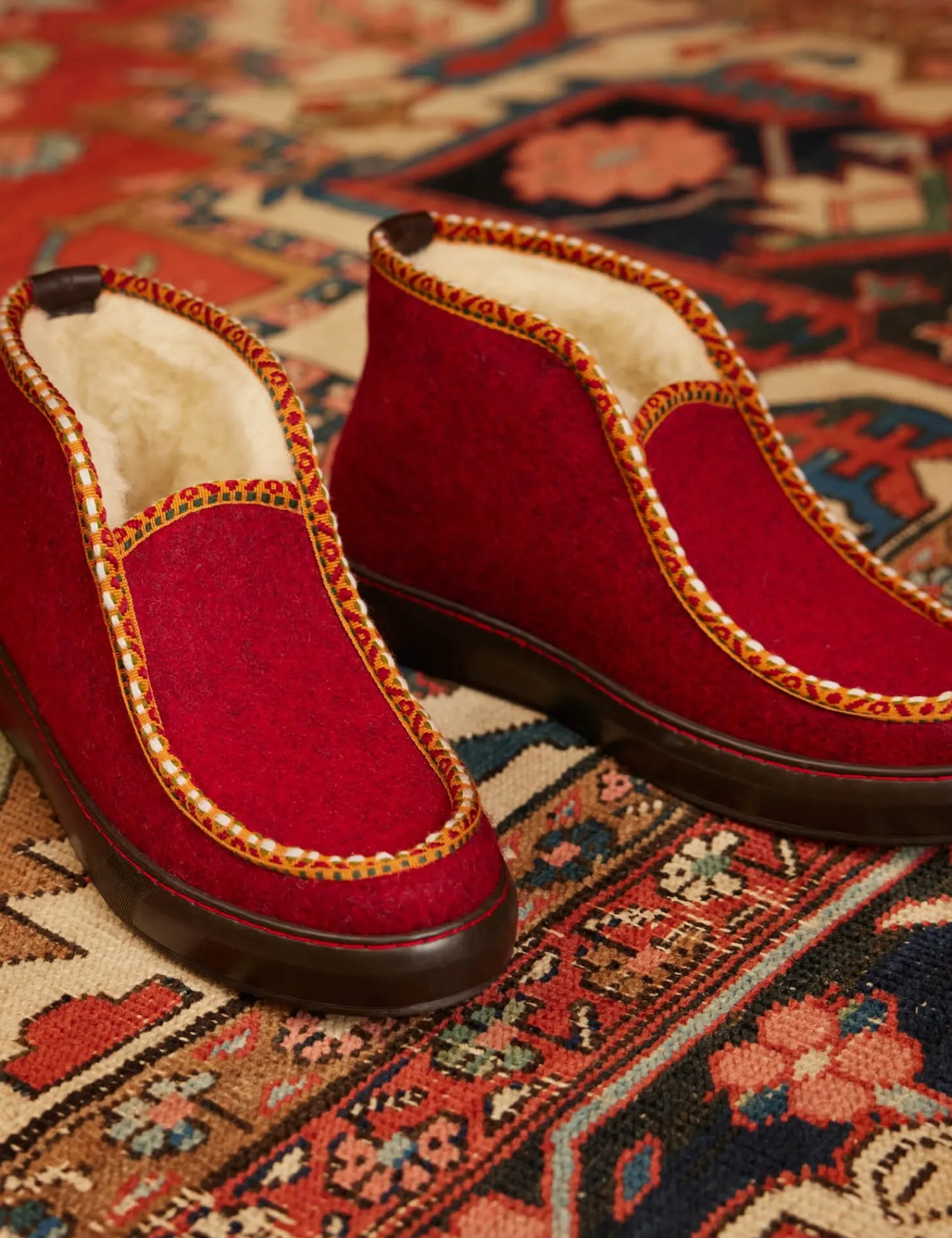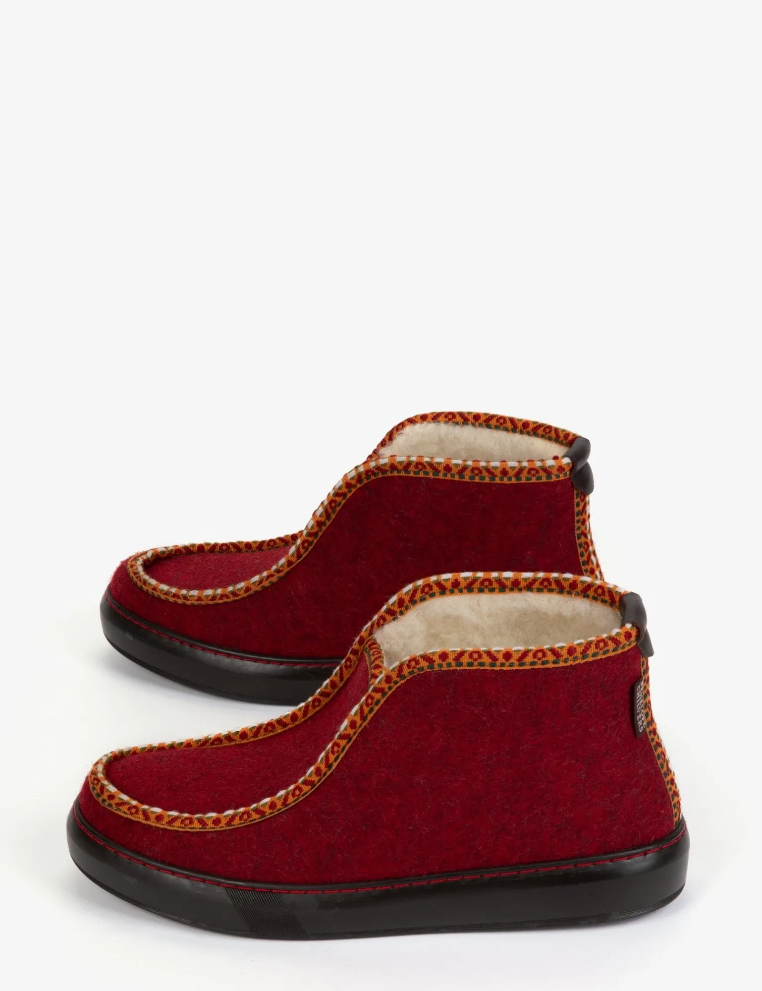 Slip into wool for natural warmth this winter! Our latest Inuit slipper design plays with rich, wintery reds and features a Suzani inspired woven trim detailing. The Inuit is much more than a slipper, designed with a practical comfortable rubber sole, that can be worn outside too – you can pop out to the garden in them or keep them by the back door for slipping into!