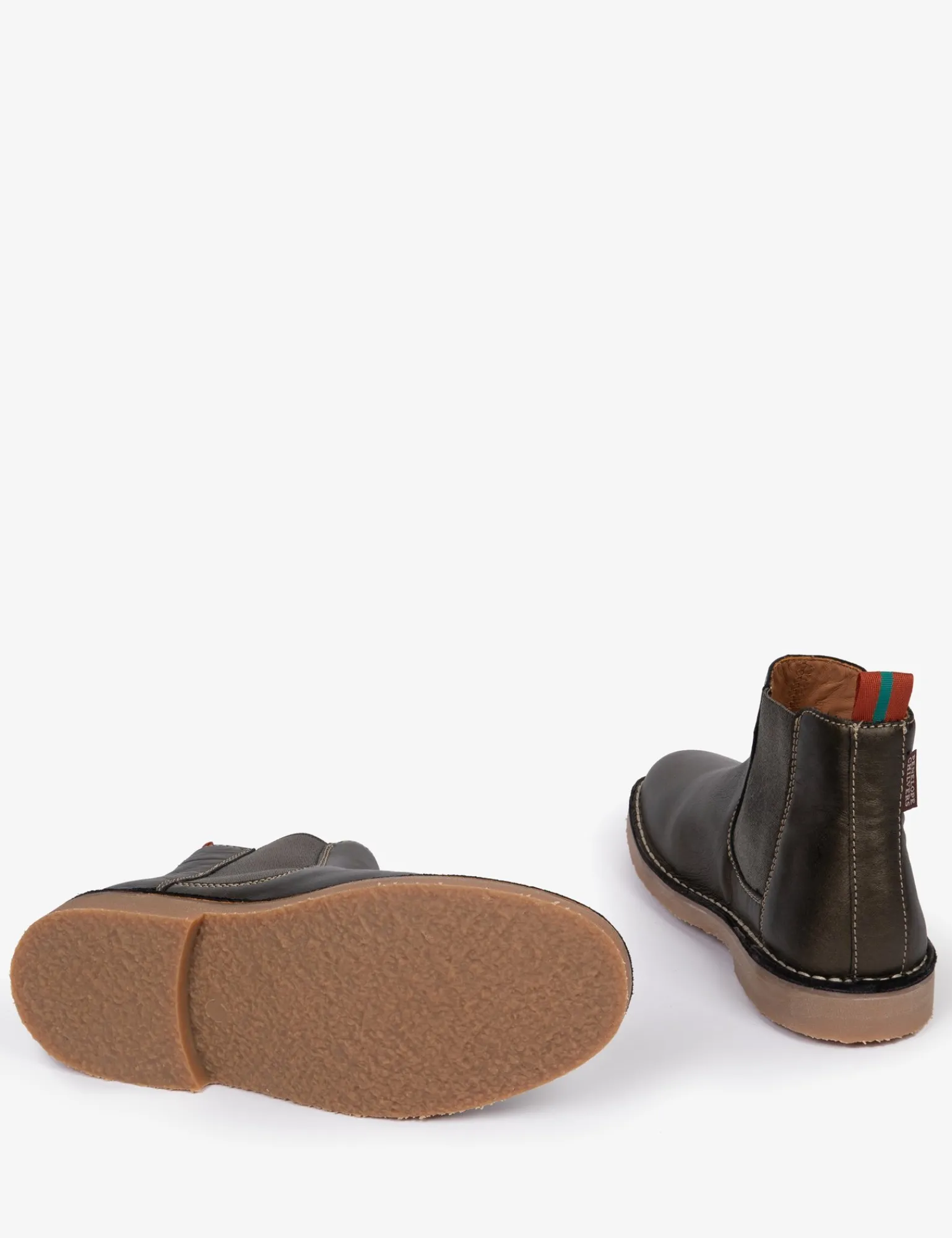 The ideal late summer to early winter boot, the Rambla is a Chelsea style designed for those lighter, airy, still-a-little-warm days. Featuring a soft khaki suede upper, metallic elasticated insert and light crepe sole, alongside our fun, signature orange, mid-sole stripe. This lightweight boot, made for us in the classic boot-making ‘Billy technique’ will work hard for you. The ideal boot for kicking up dust on safari or taking on rambla-ing adventures at home or abroad.