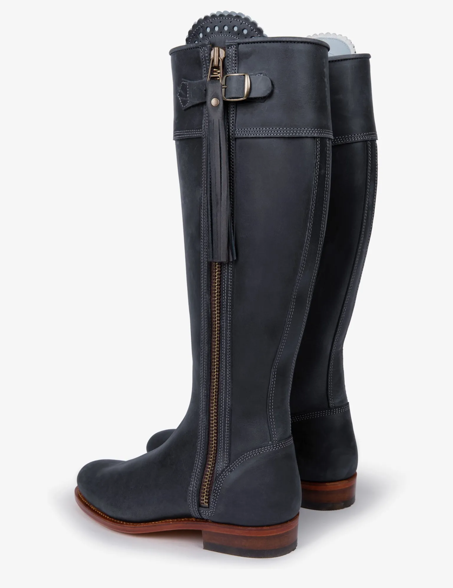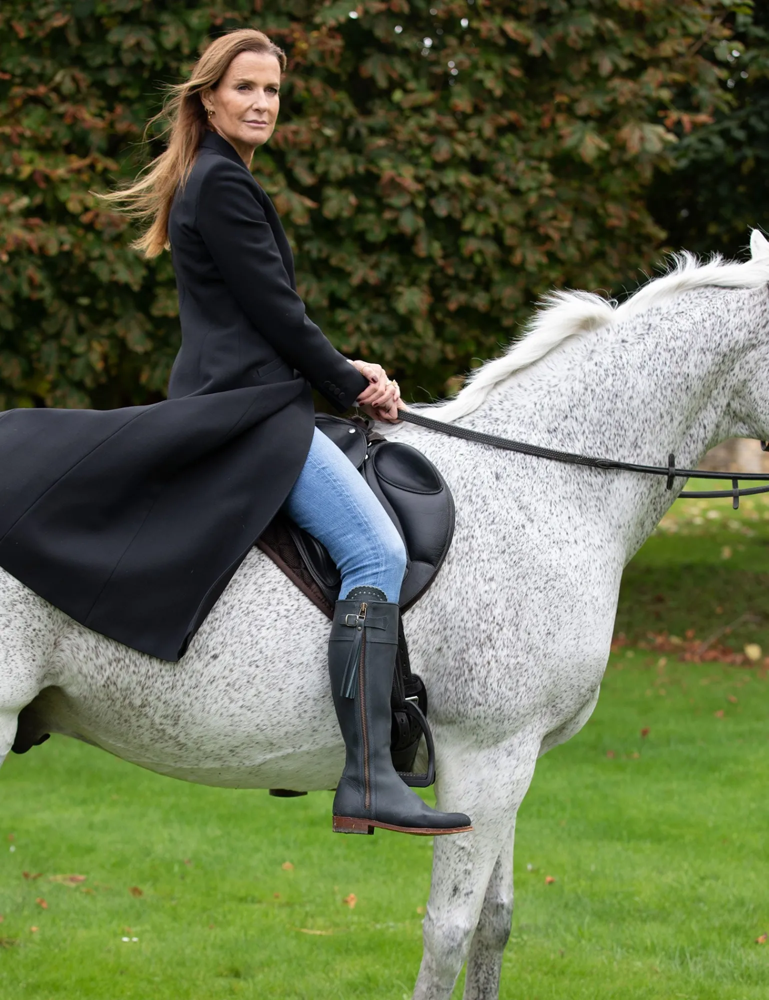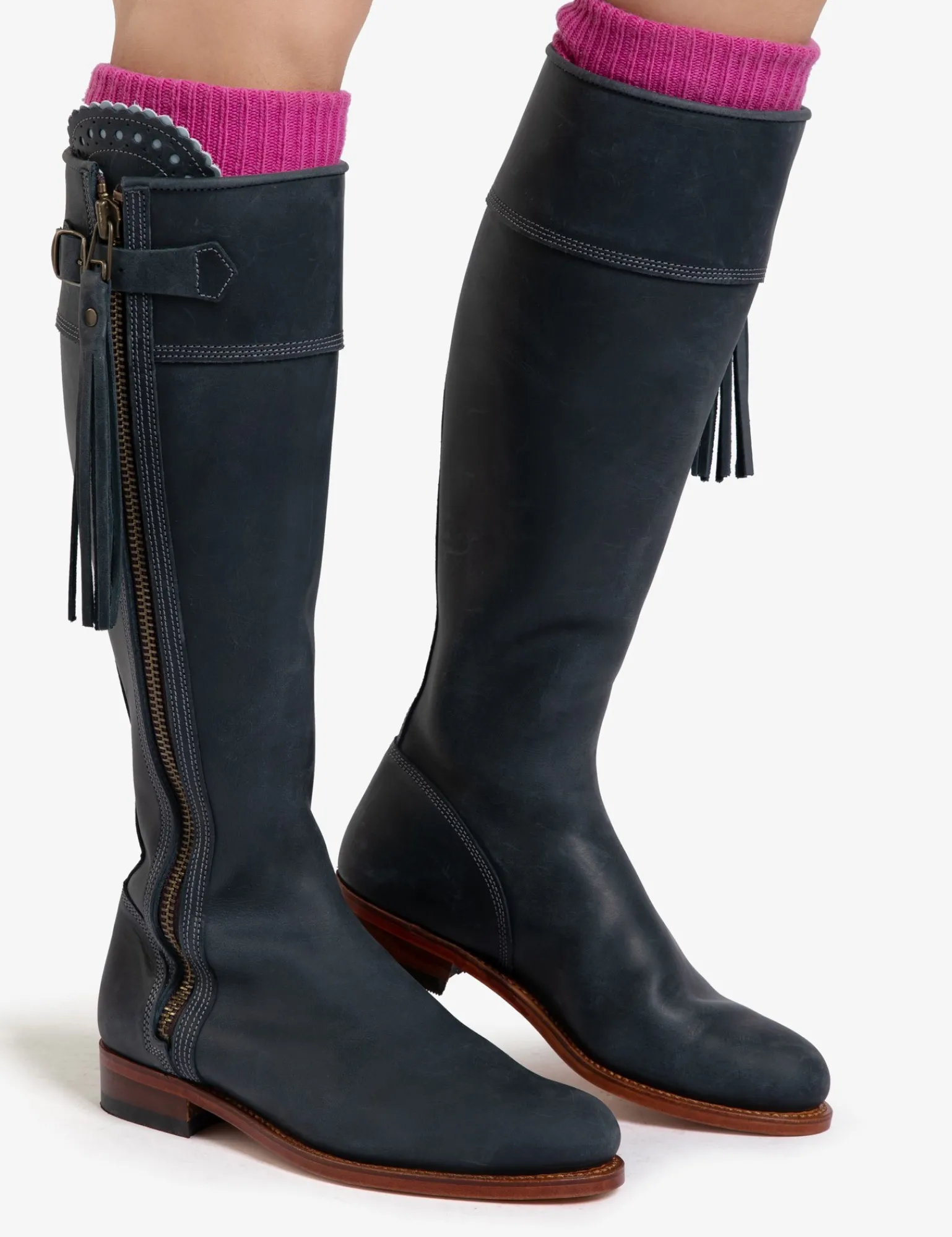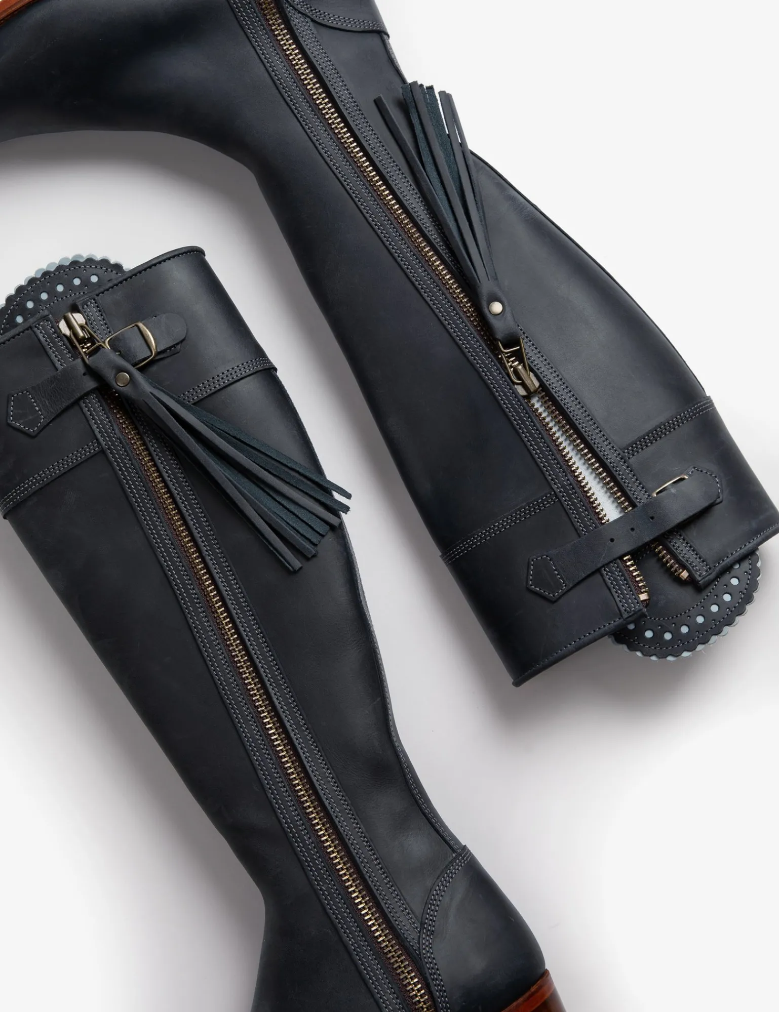 Our India Hicks Tassel Boot in sustainably sourced Spanish leather, are the epitome of luxury. Exclusively cut for us close to the ankle for a more feminine fit, and with a scallop detail at the zip panel and a leather tassel on the pull. These Handmade boots have the finest of detailing seen in contrasting pale dove-egg blue and an elegant slim leather sole. A wonderfully practical boot, made to last, and worn by HRH Catherine, Princess of Wales. They encase the leg beautifully giving a sleek, leg-lengthening, and elegant silhouette, and are available in 2 sizes; Standard and Generous.