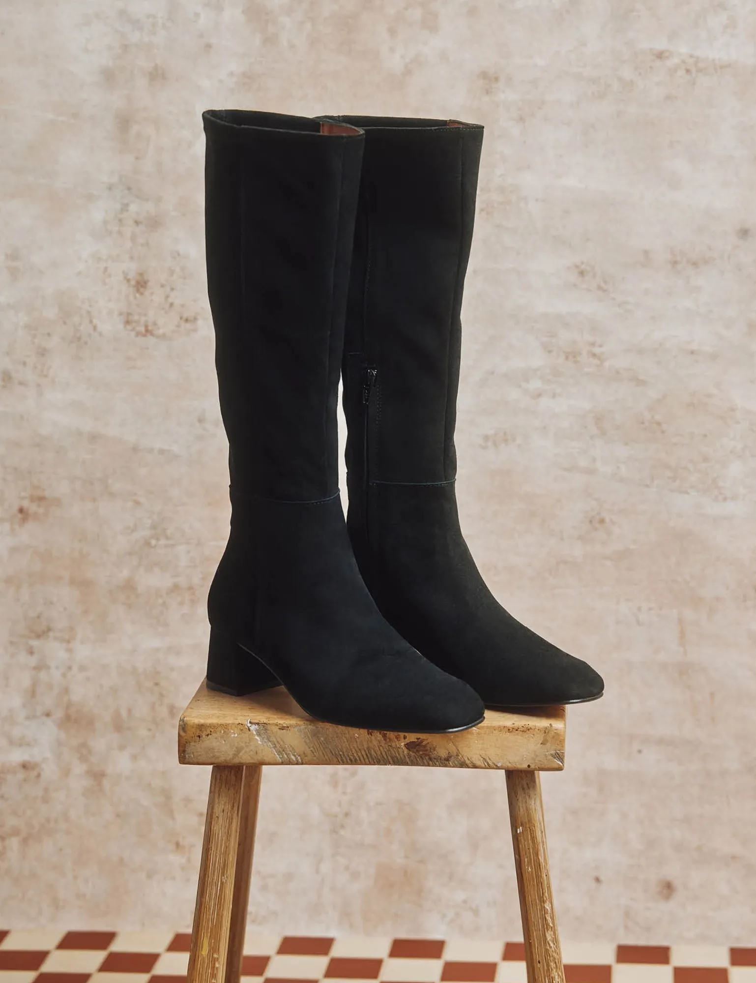 The Sinatra sings of old school glamour and the days of Studio 54. A square toed boot, that is based on the same fit as our best-selling square toed Mary Janes, this 70’s inspired style features a mid-height elephant heel and hidden elasticated calf dart to ensure a snug, comfortable fit. Available in our signature soft suede, in an easy to wear black. Pair with a skirt for a cute look that will take you from late summer, right through winter and into spring.