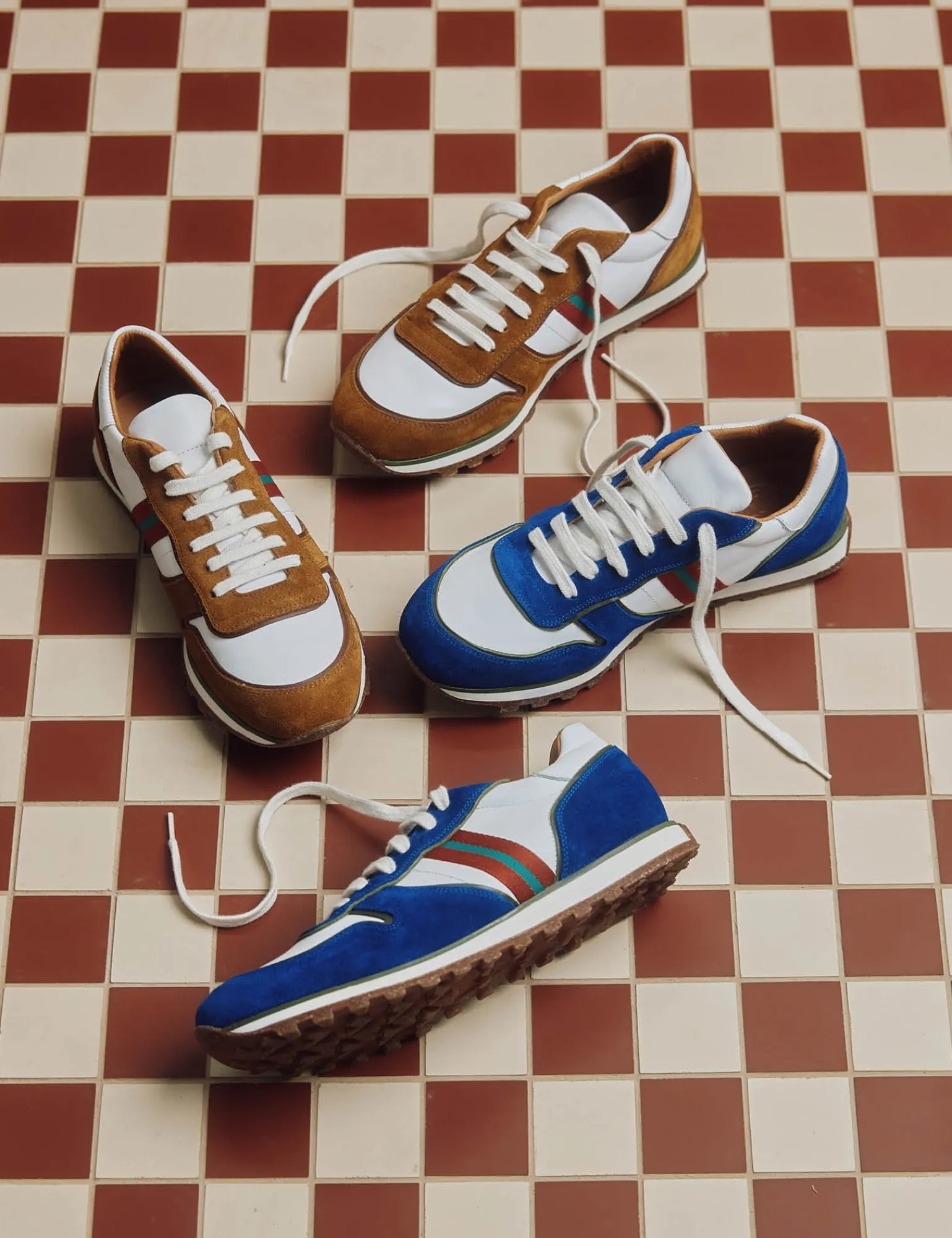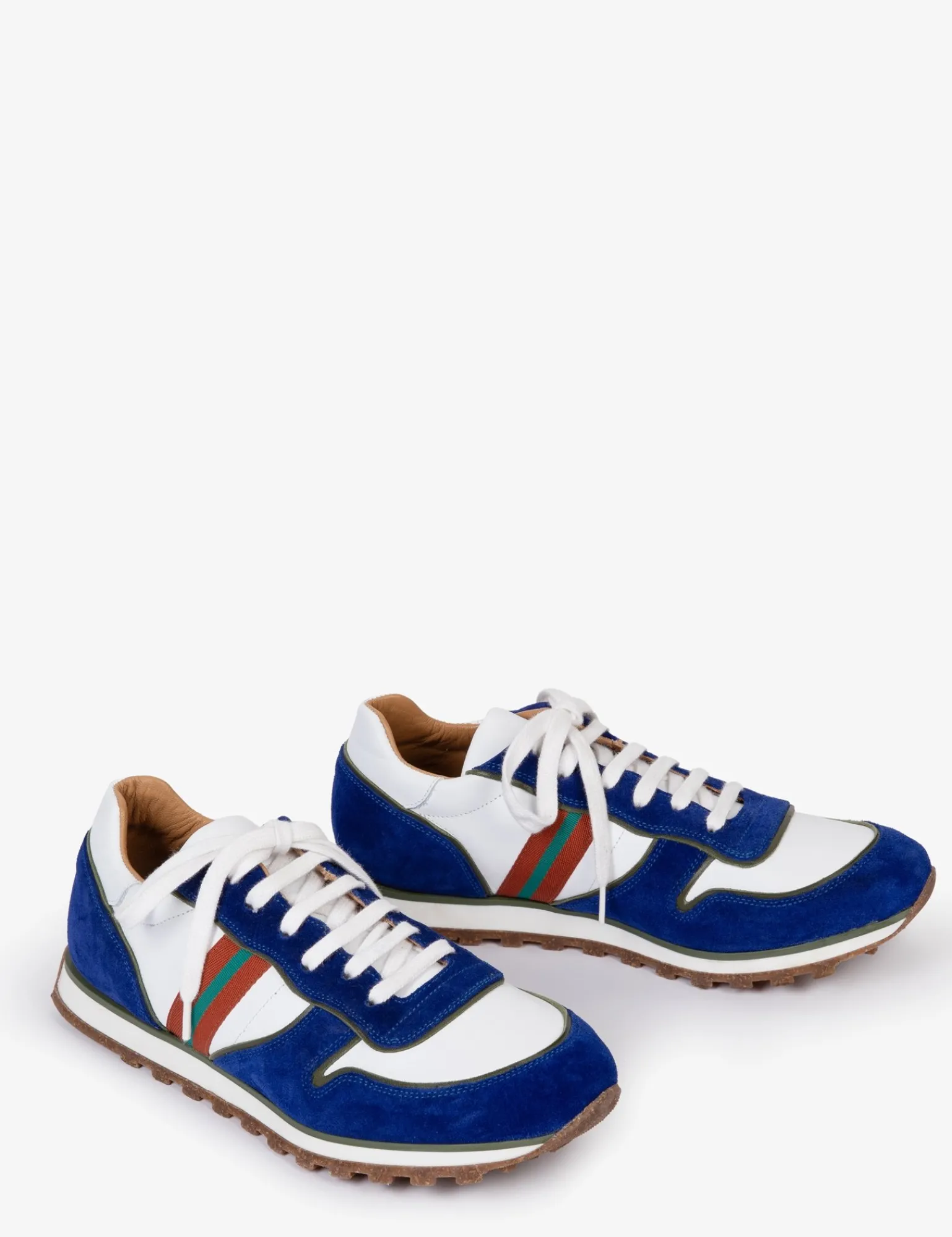 Re-energise your autumn wardrobe with our newest Studio Trainer styles, inspired by vintage sneakers with a slimmer silhouette and cleated sole. Pops of washed suede in either a cobalt blue or a casual tan, sit on top of a white leather base with our distinctive branded stripe to finish. Fully calfskin lined with a soft, supportive insole and cork and rubber sole.