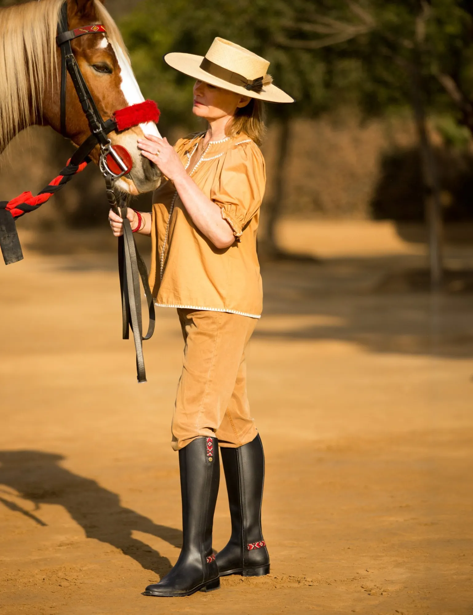The SUJÁN Riding Boot is an equestrian boot, cut close to the leg, with an elegant silhouette, and a smooth sole, and is the perfect boot to ride in style at the SUJÁN Stables, where you’ll find beautiful Marwari horses smartly tacked up in black leather saddles and bridles with intricate woven details, matching the same hint of scarlet red found in our boot. These limited handmade boots are wonderfully practical boots that are made to last and are as perfect for riding adventures in the wild as they are at home or in the city, to elevate any everyday look.