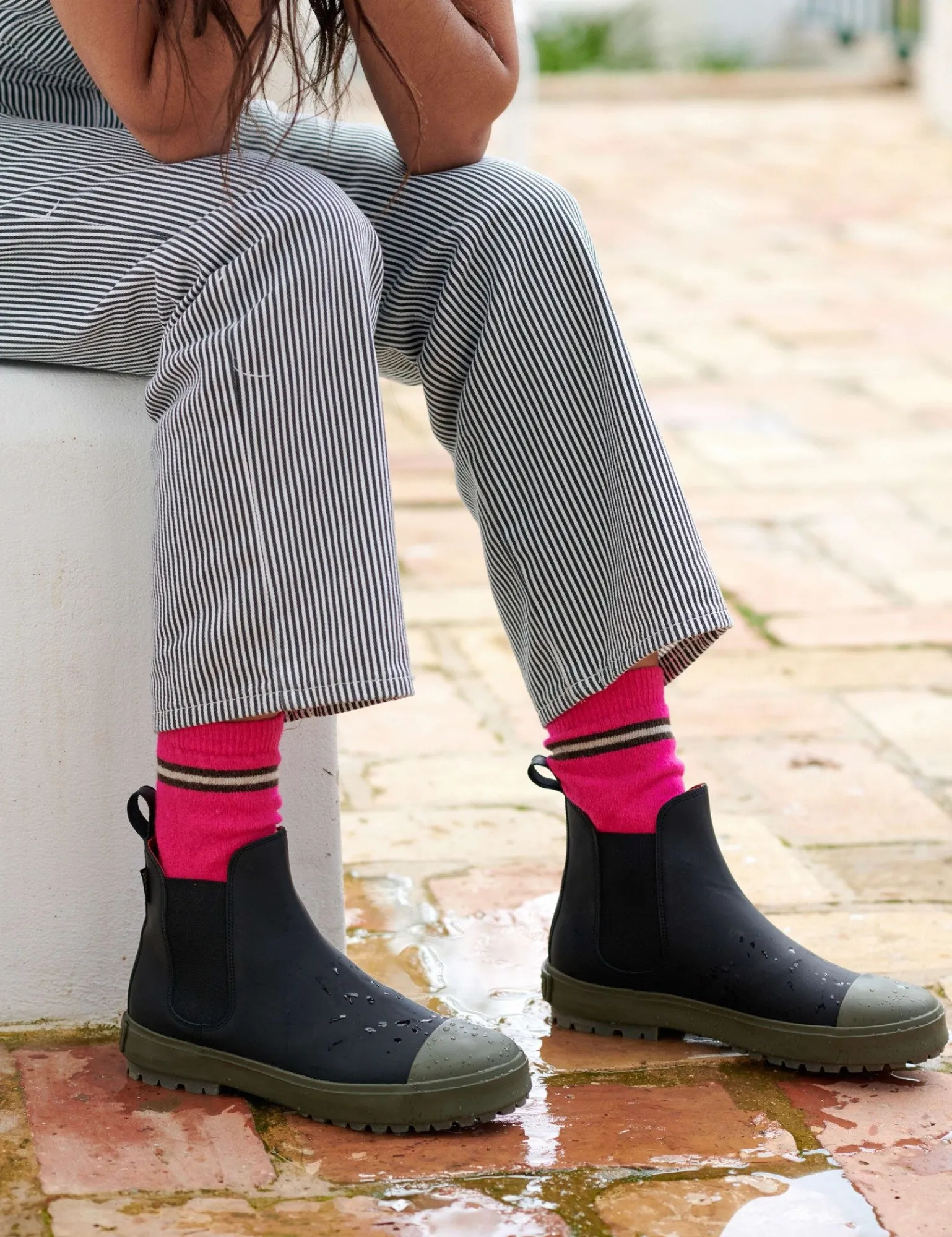 Our luxurious lambswool socks are designed to complement our deep winter collection in a pop of neon pink and will work throughout the season to add colour and texture. Layer with clogs and boots to soften the look. The stripe trim design is inspired by our classic signature pull from our Heritage Boot Collection. Wash in the machine on a gentle wool cycle or hand wash and leave to dry naturally.