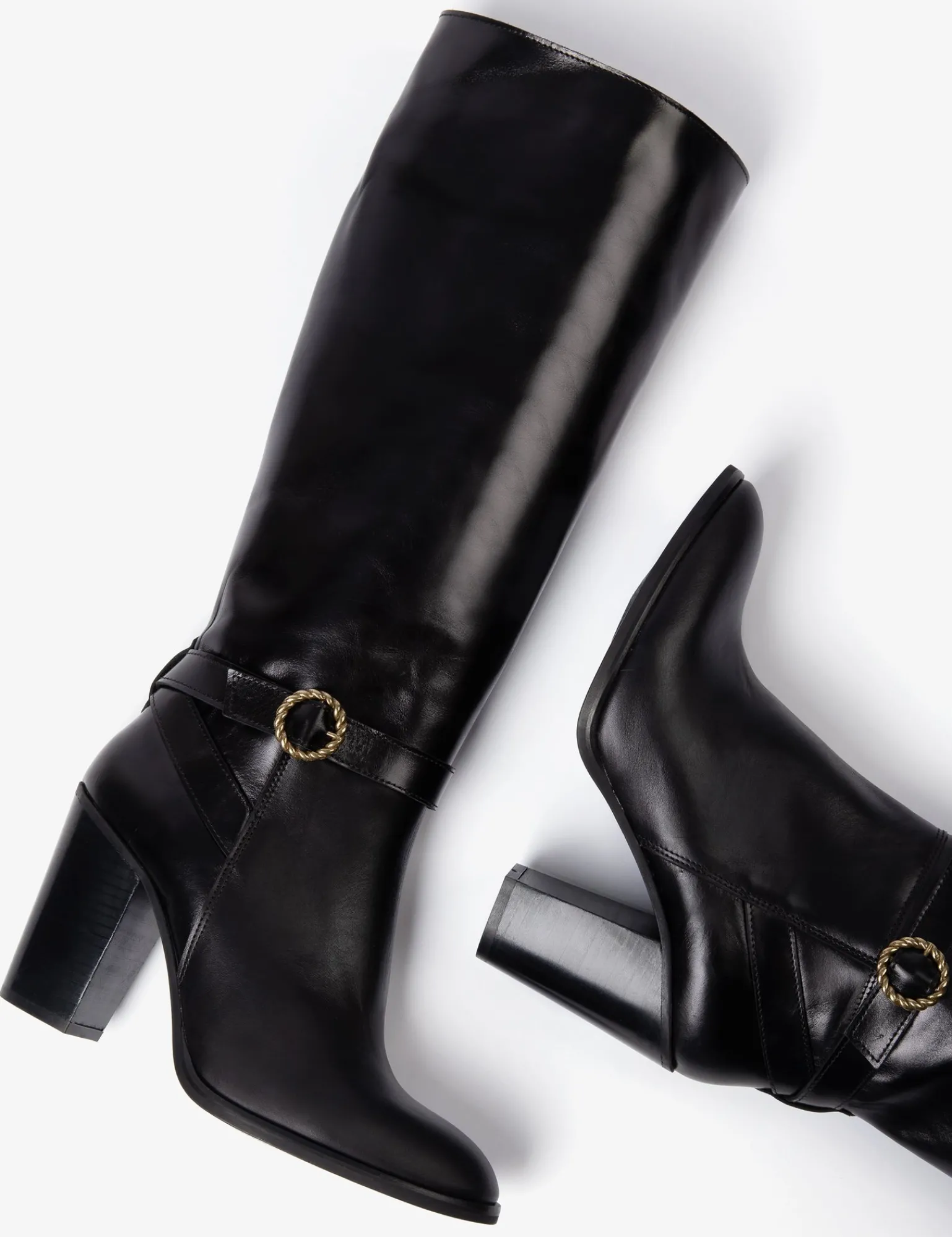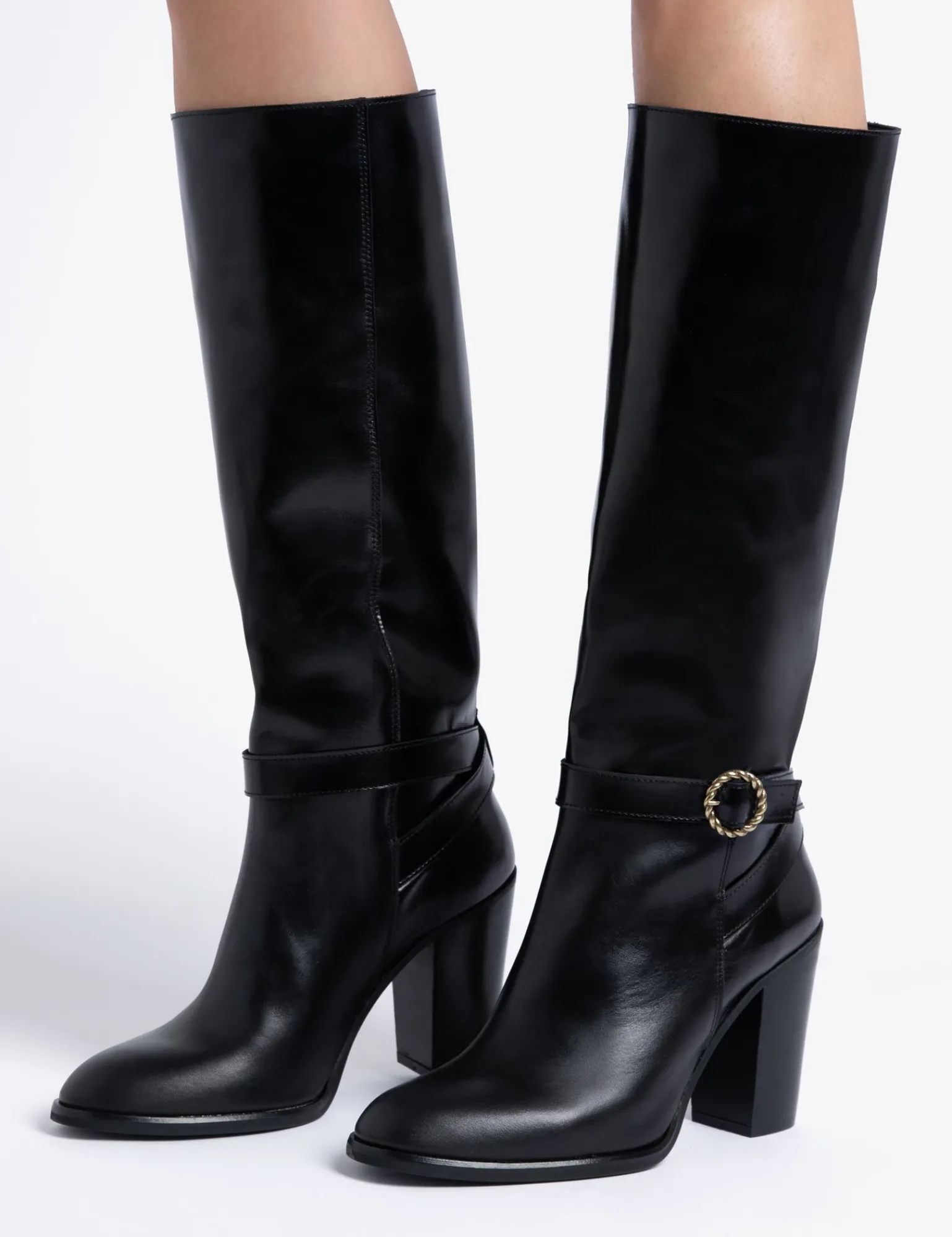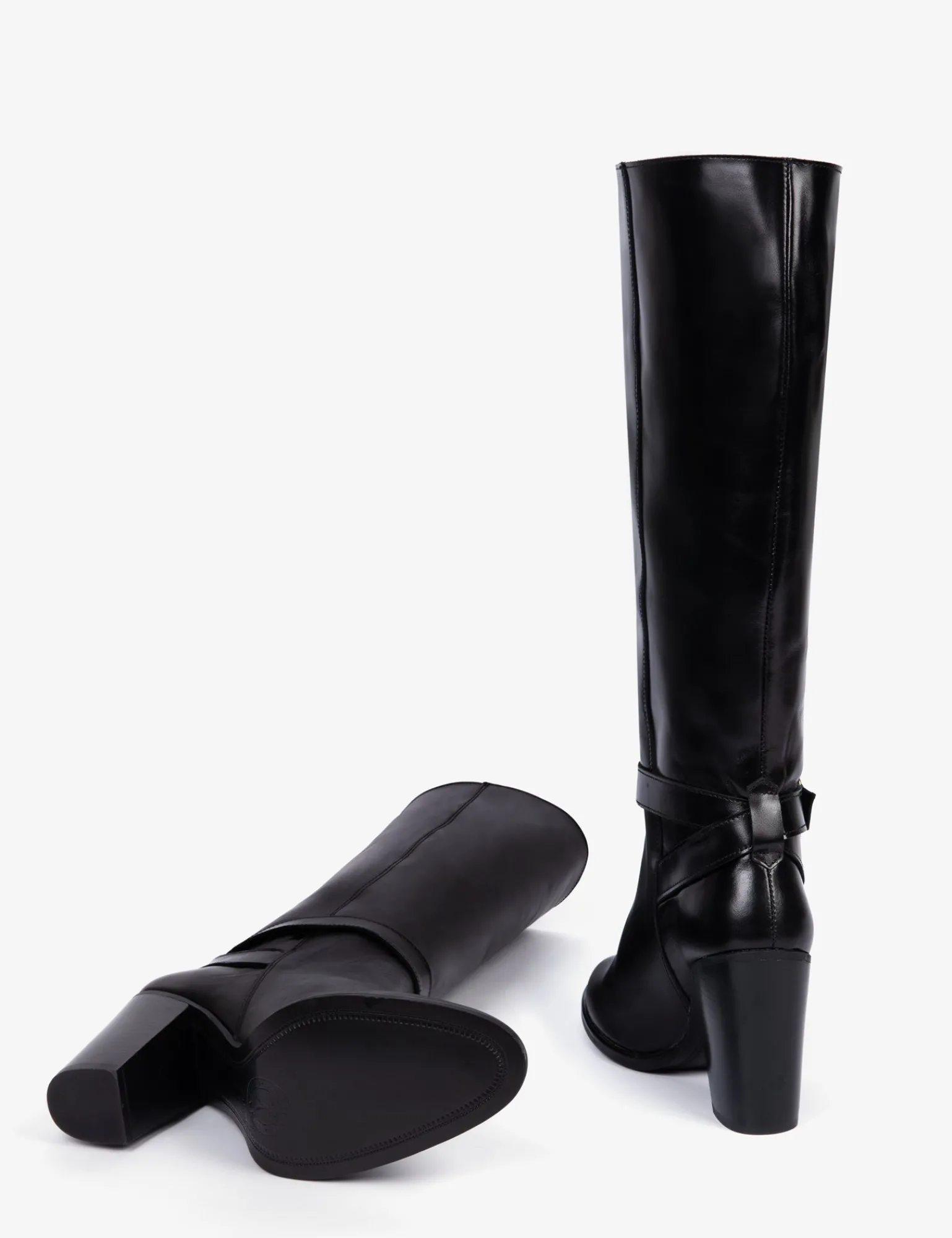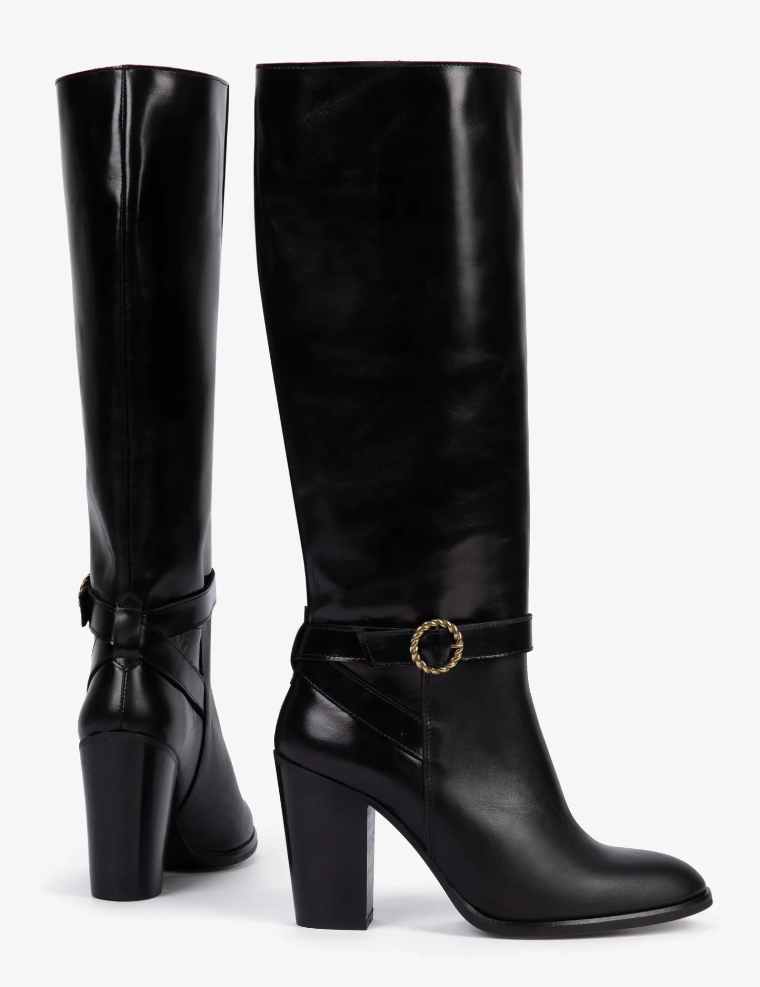 The Burford Boot forms part of our Raceday range with its refined long shaft silhouette and an elegant block heel, made from polished black equestrian-style leather. Made in Spain by our equestrian boot makers, these boots feature a buckled harness giving chic equestrian styling designed as your go-to style for a day at the races or any country event, with its stylish brass barley twist buckle.
