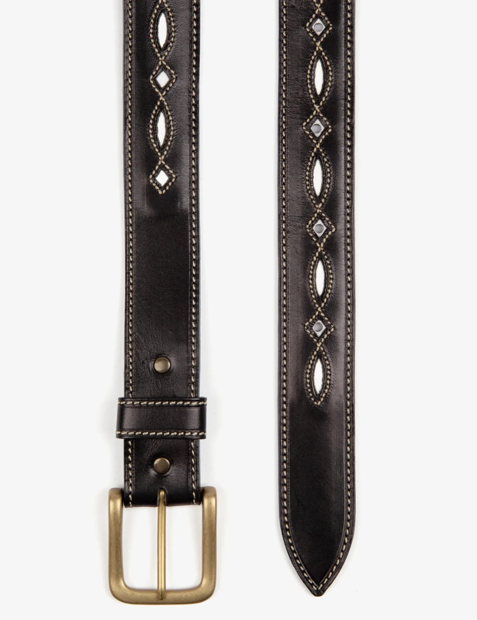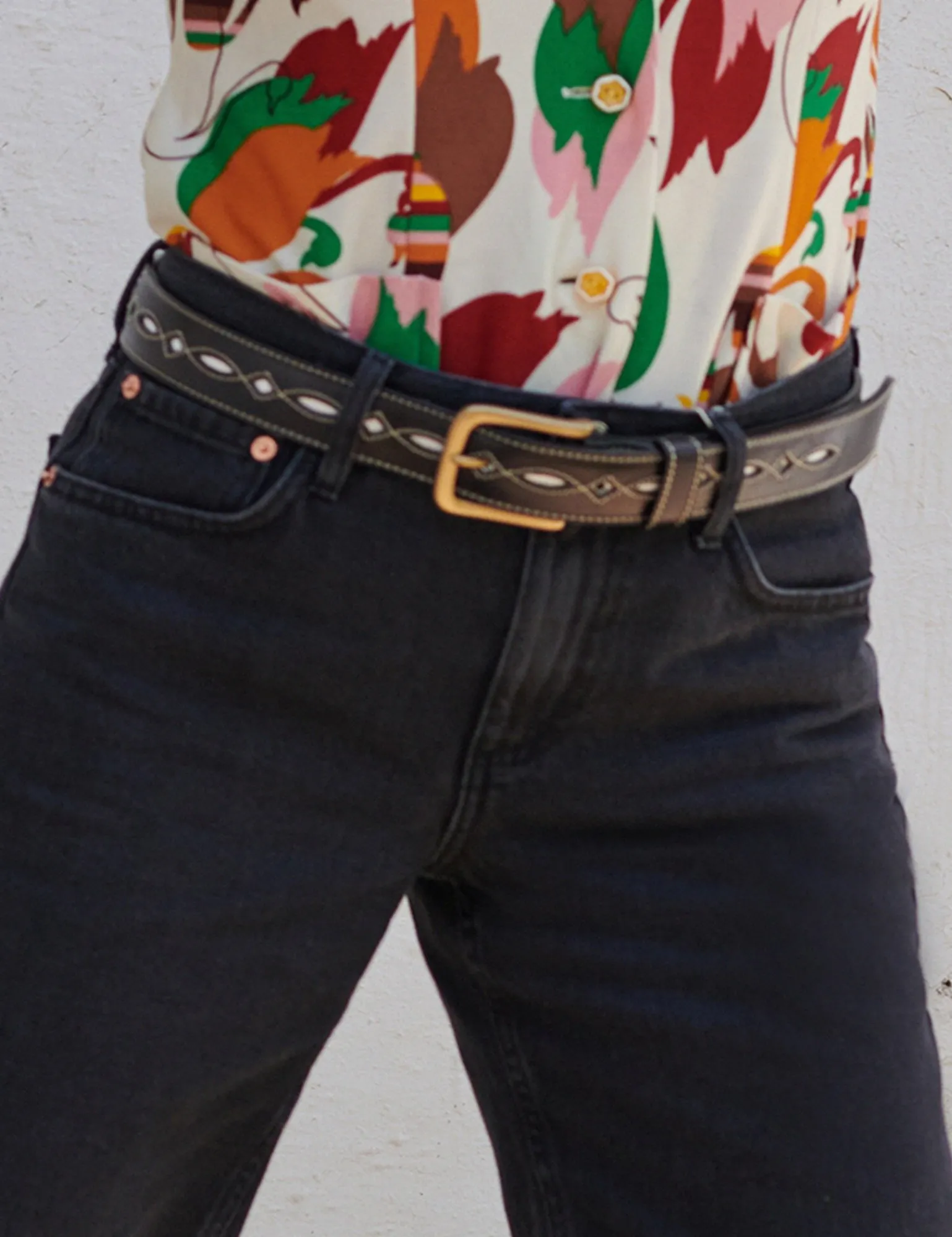 Handcrafted in vegetable dye leather, the Caramelo Belt is inspired by authentic Spanish hand-punched, trocollage designs from the archives. This cut out design with white leather underlay and over-stitching in bone white, depicts a wrapped sweet shape, and is so-named, ‘caramelo’ – the Spanish word for ‘sweet’. Available in this easy combination of black and white as a timeless design in a classic colourway.