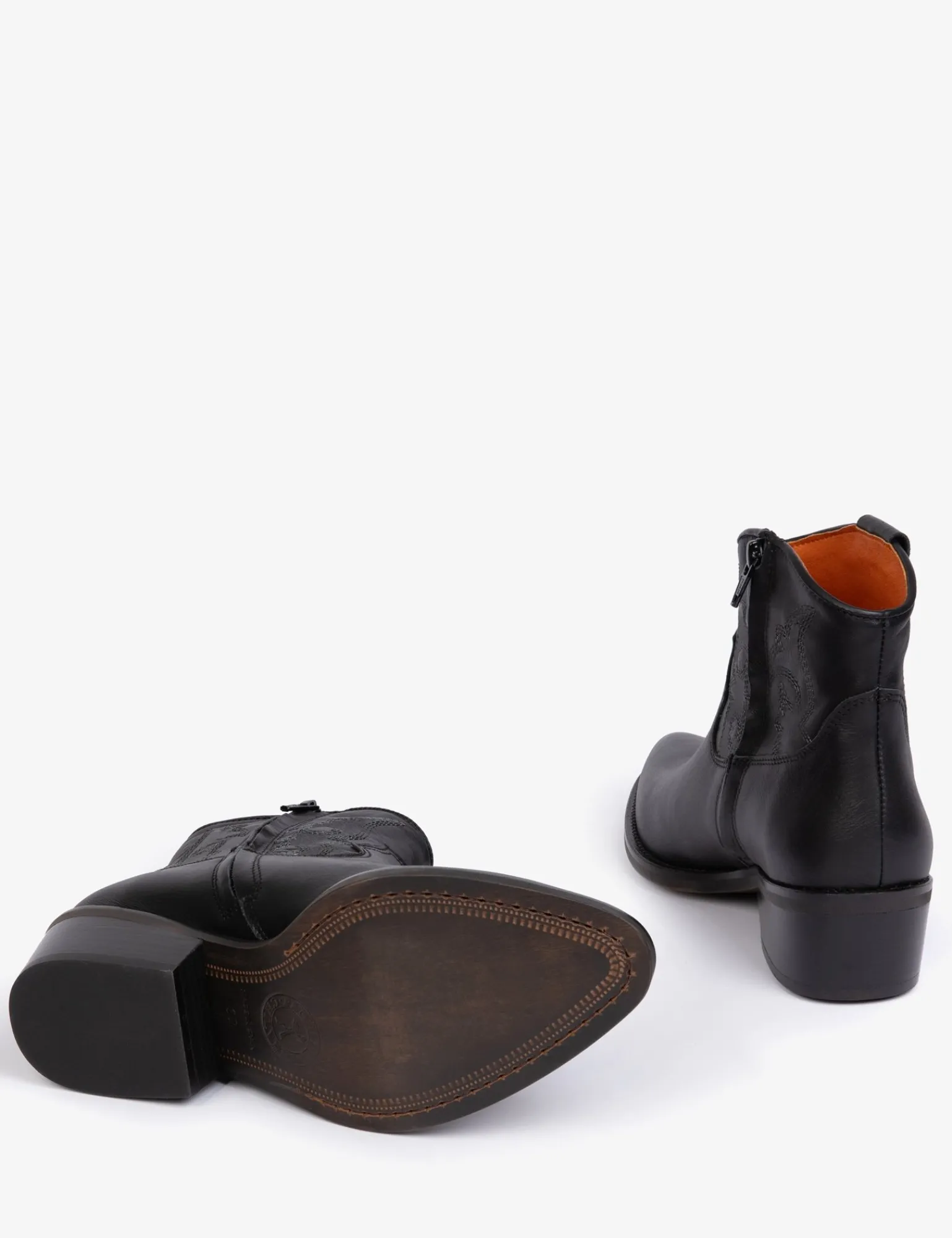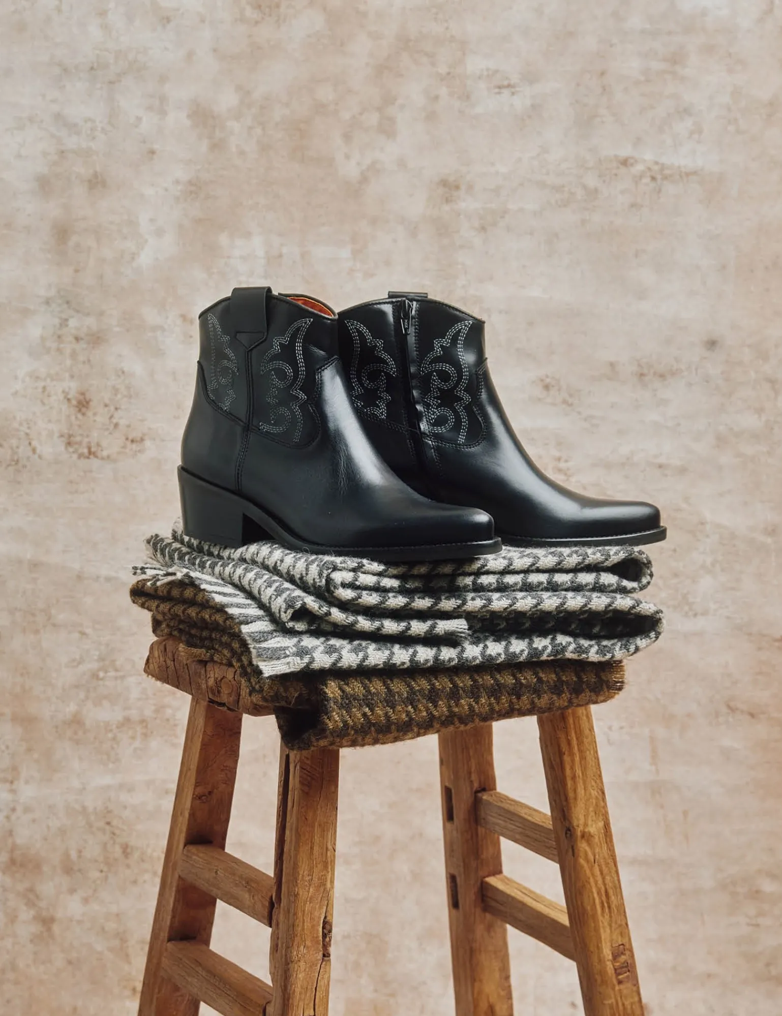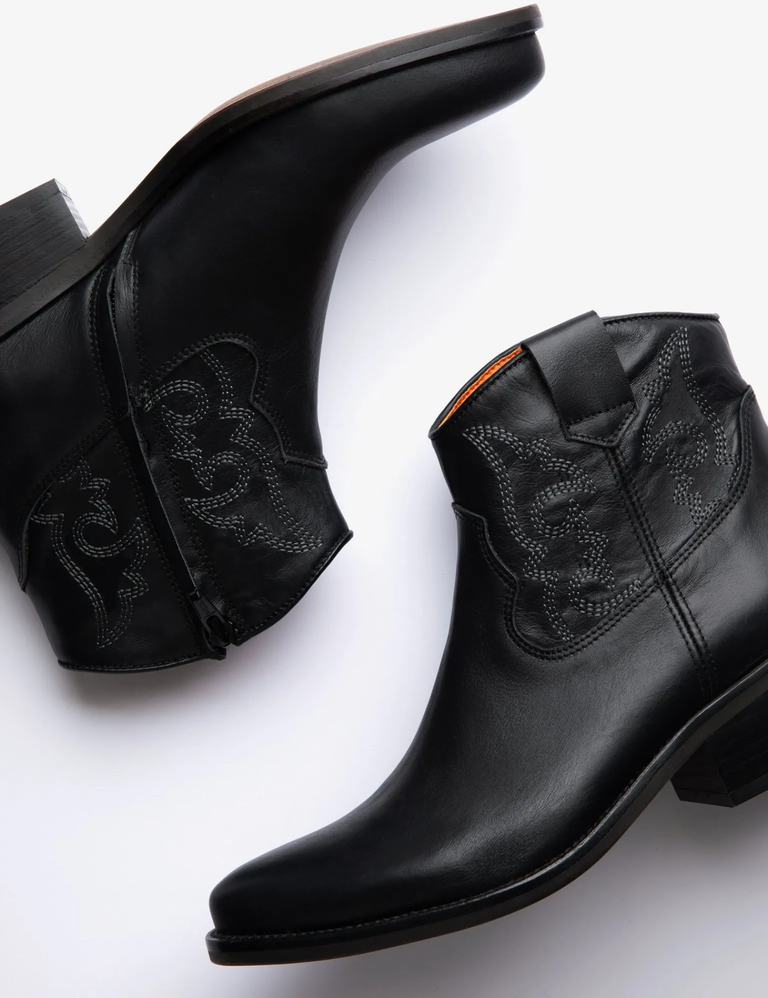 The Cassidy is a western inspired style with authentic hand stitched detailing. This boot is cropped to the ankle with a low Cuban heel and inside zip, for an easy, snug fit. Available for Autumn in either Peat and Bitter Chocolate suede or an easy Black leather. Wear the Cassidy informally in the day with a romantic dress, or pair with jeans for a transitional stylish look.