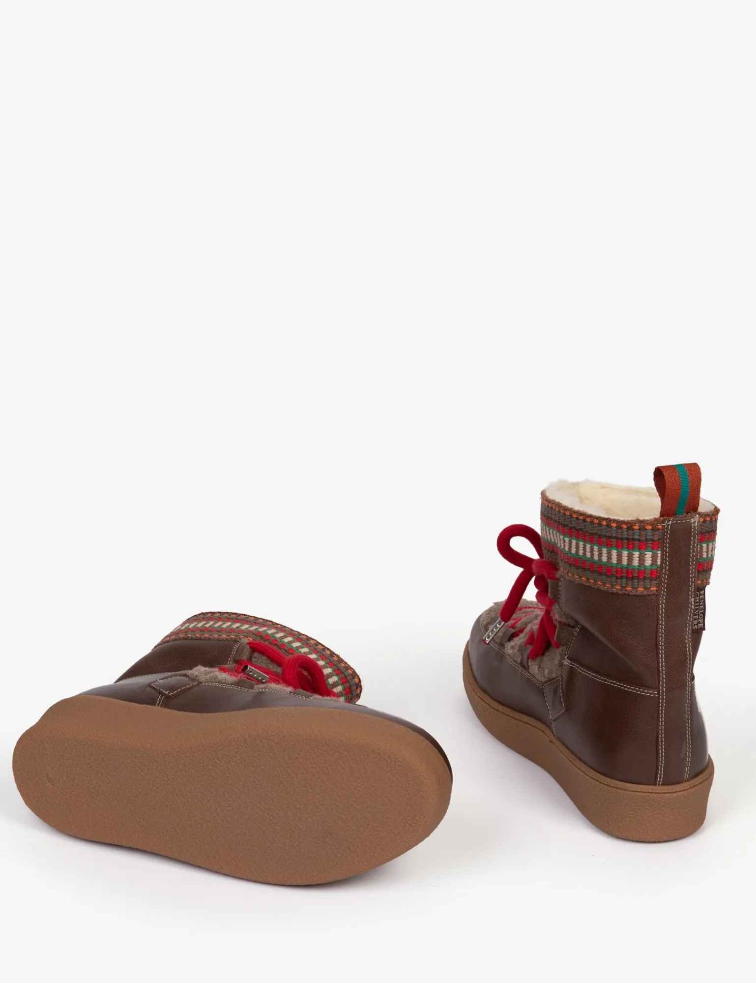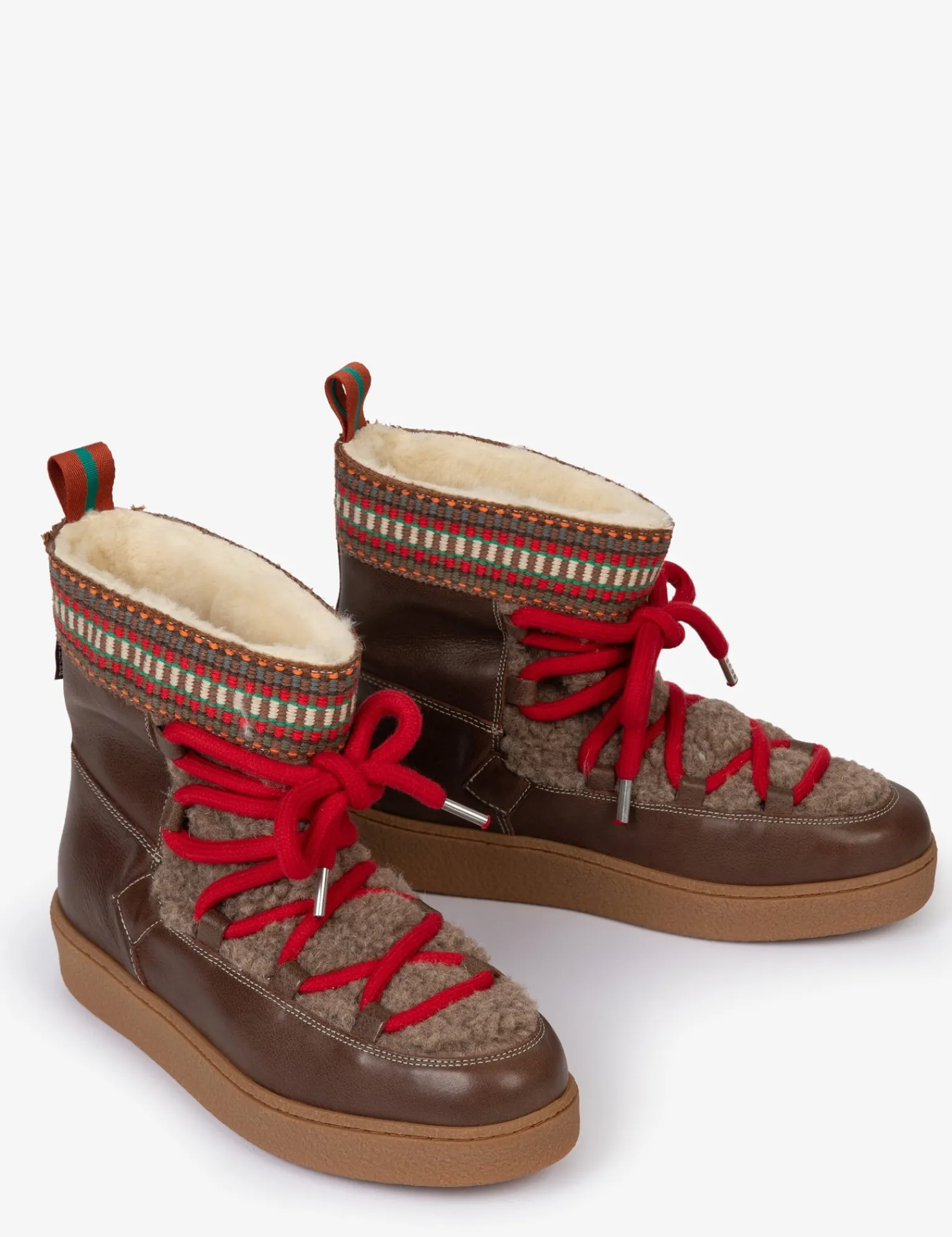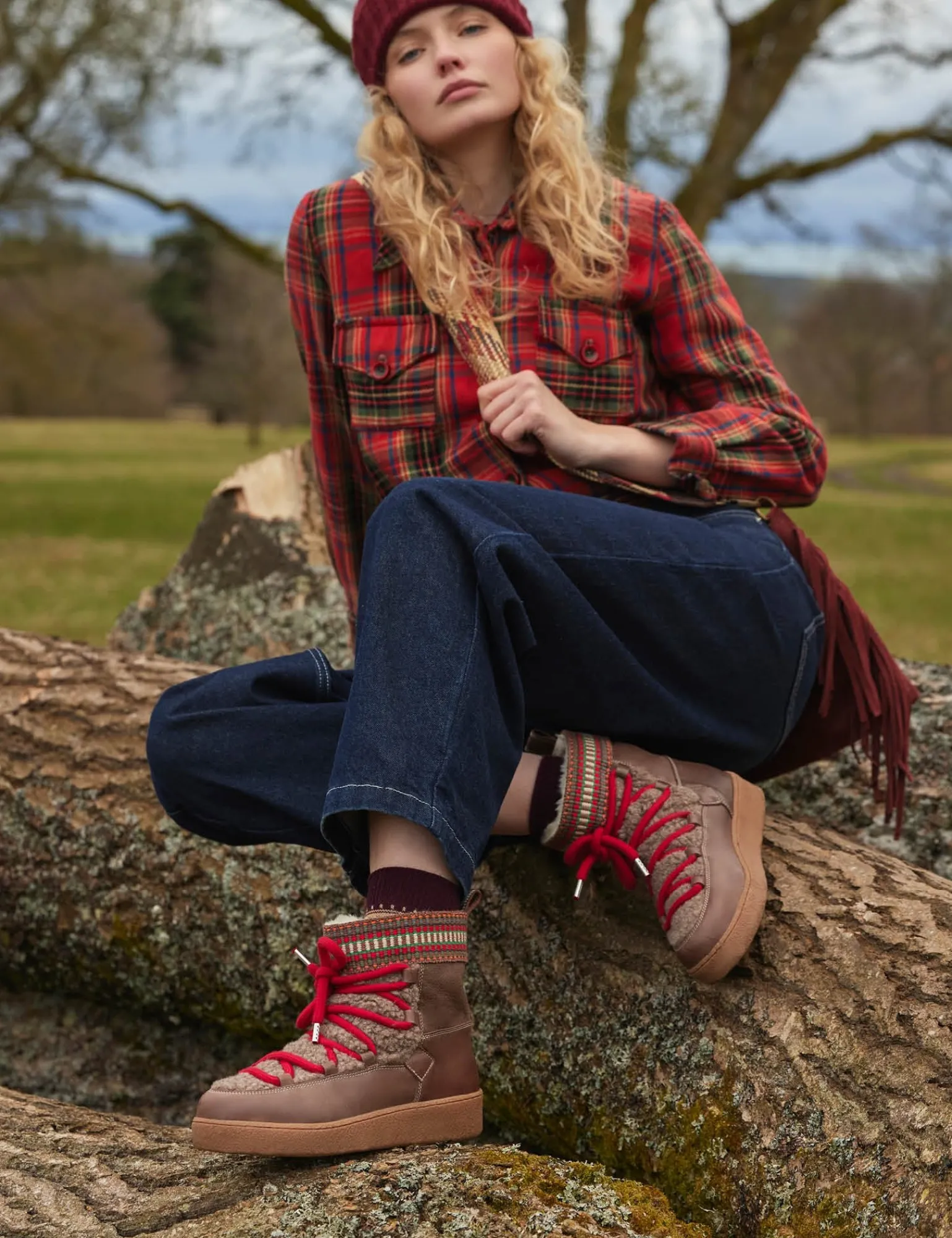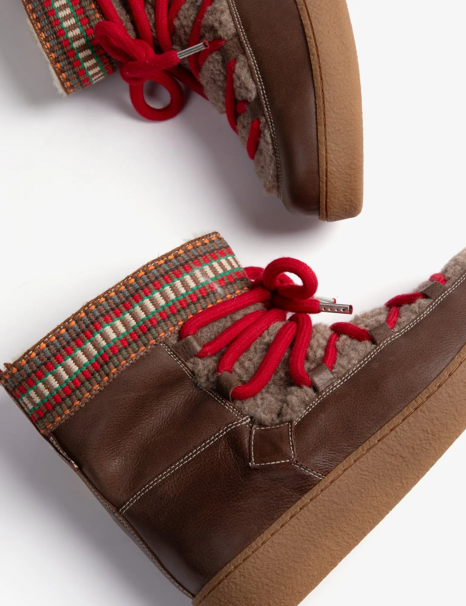 The Cosmos Boot is a luxurious snow boot for the coldest days, designed in sustainably sourced suede and leather with an organic cotton, Nordic-inspired trim, to give it a more folky, fun feel. This style is also fully lined inside with 100% wool for superior warmth and comfort. An easy piece, with chunky laces and a thick sole, this boot is a stylish, and practical choice, for life on the go in the winter, or cosy days spent on holiday in the mountains!