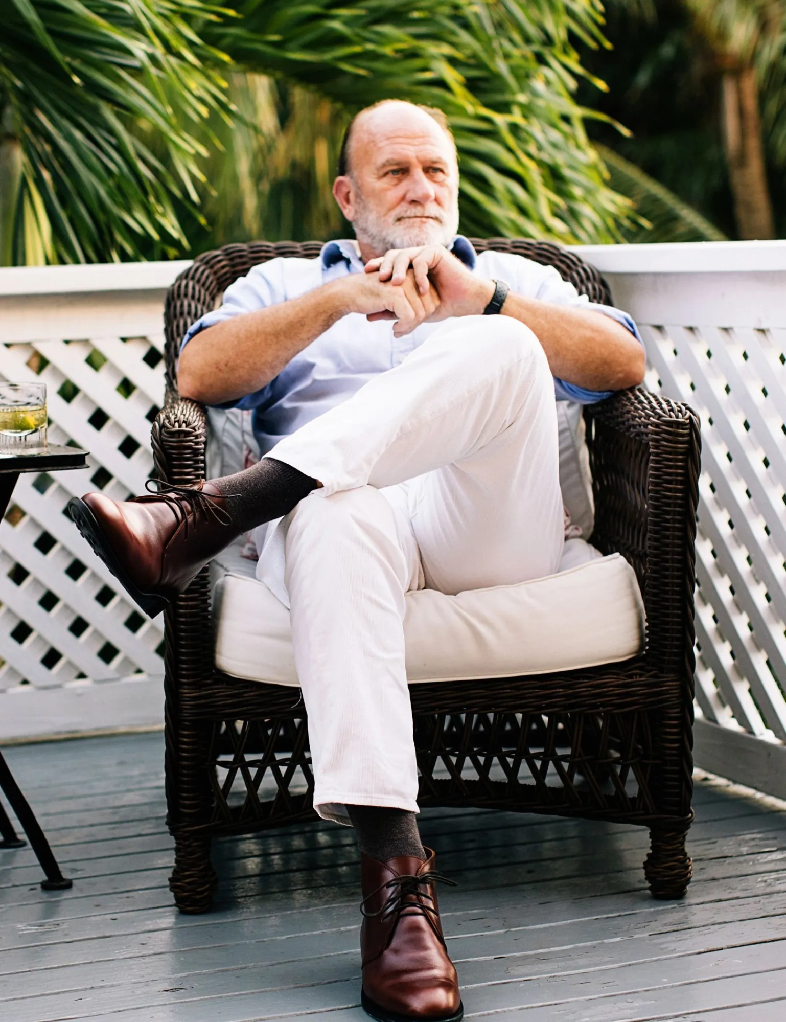 Introducing the Flint Wood Chukka, named after a friend of Penelope’s, who lives in boots when not barefoot at home on Harbour Island.David appreciates good quality and admires our Goodyear welt construction for it’s inordinate quality. We made him some in rich rum coloured leather, which he chose for it’s depth of hue and polish-ability. These boots will only get better with wear, just like a premium aged rum.