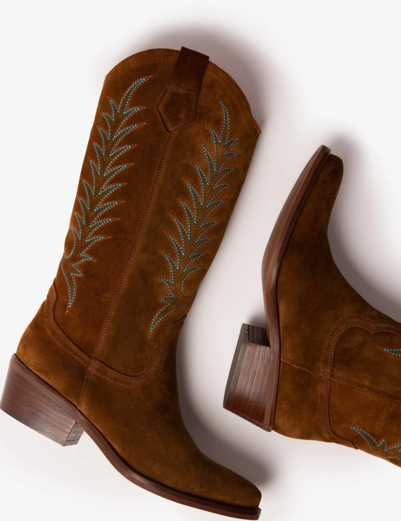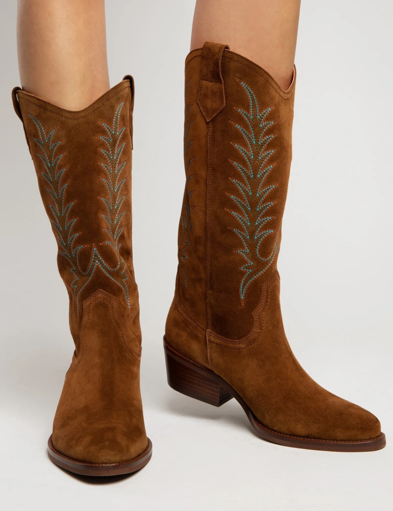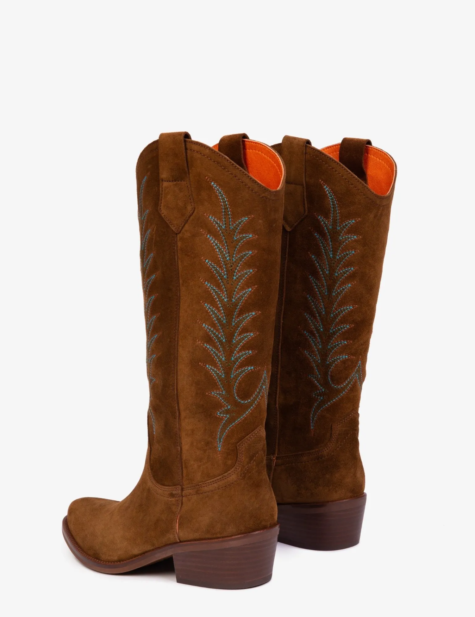 Our Goldie Embroidered boot is a quintessential cowboy boot at its most elegant. Cut as a high midcalf, the Goldie is designed in a perfect winter tan suede with authentic Western embroidery in coloured triple stitch throughout. The distinctive cowboy silhouette with Cuban heel, elongated toe line, and slim fit gives this style real character and attitude.