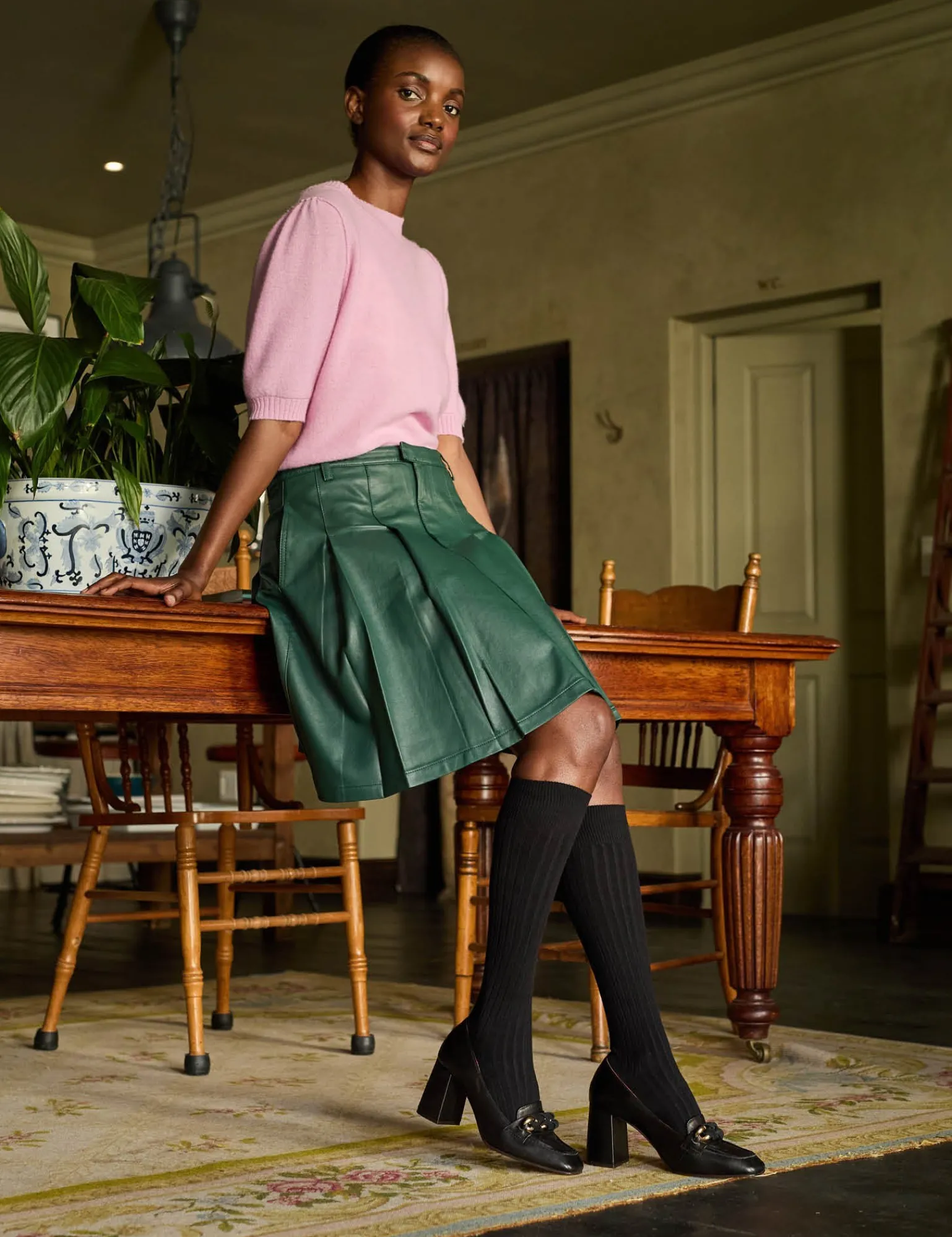 Loafers are big for us this season and the high Lorenzo loafer forms part of the family as our highest heeled style. Inspired by Italian luxury fashion and Audrey Hepburn glamour, the Lorenzo has been exquisitely handcrafted from the most buttery, luxurious glove-like leathers we work with, in a rich black. Elegant and stylised, with a hand wrapped leather adornment, a rounded square toe, and stylised feature heel, it forms part of our most premium loafer offering of the season. It’s our sexiest loafer. Wear with flared trousers, or a skirt, and contrast tights for an added pop of colour.