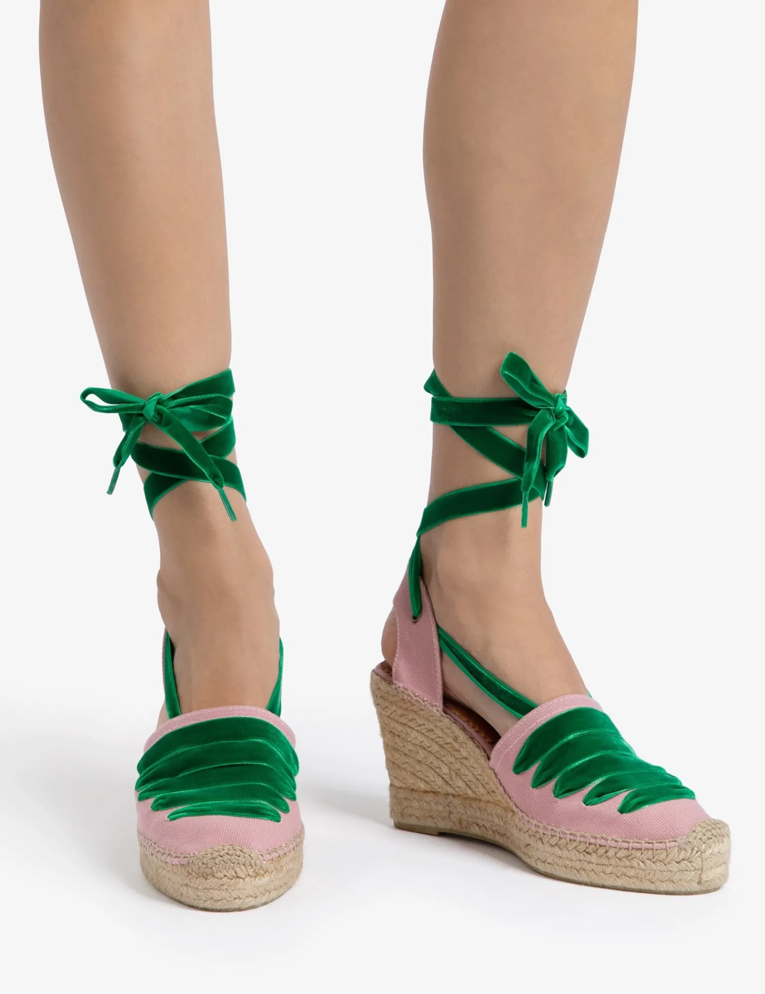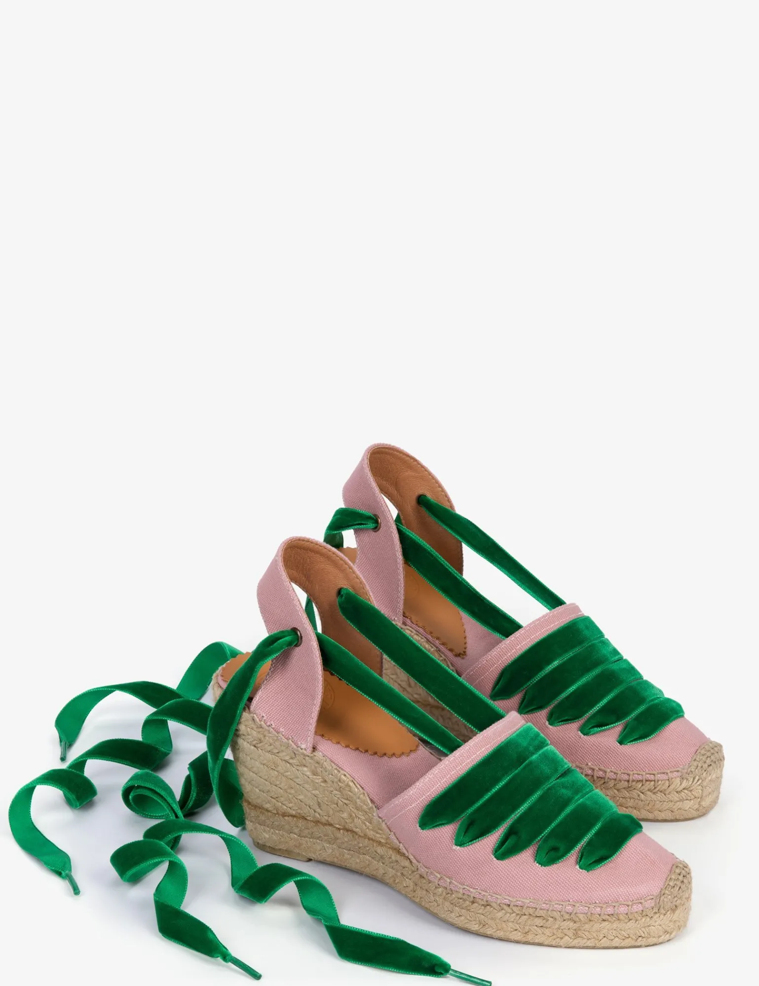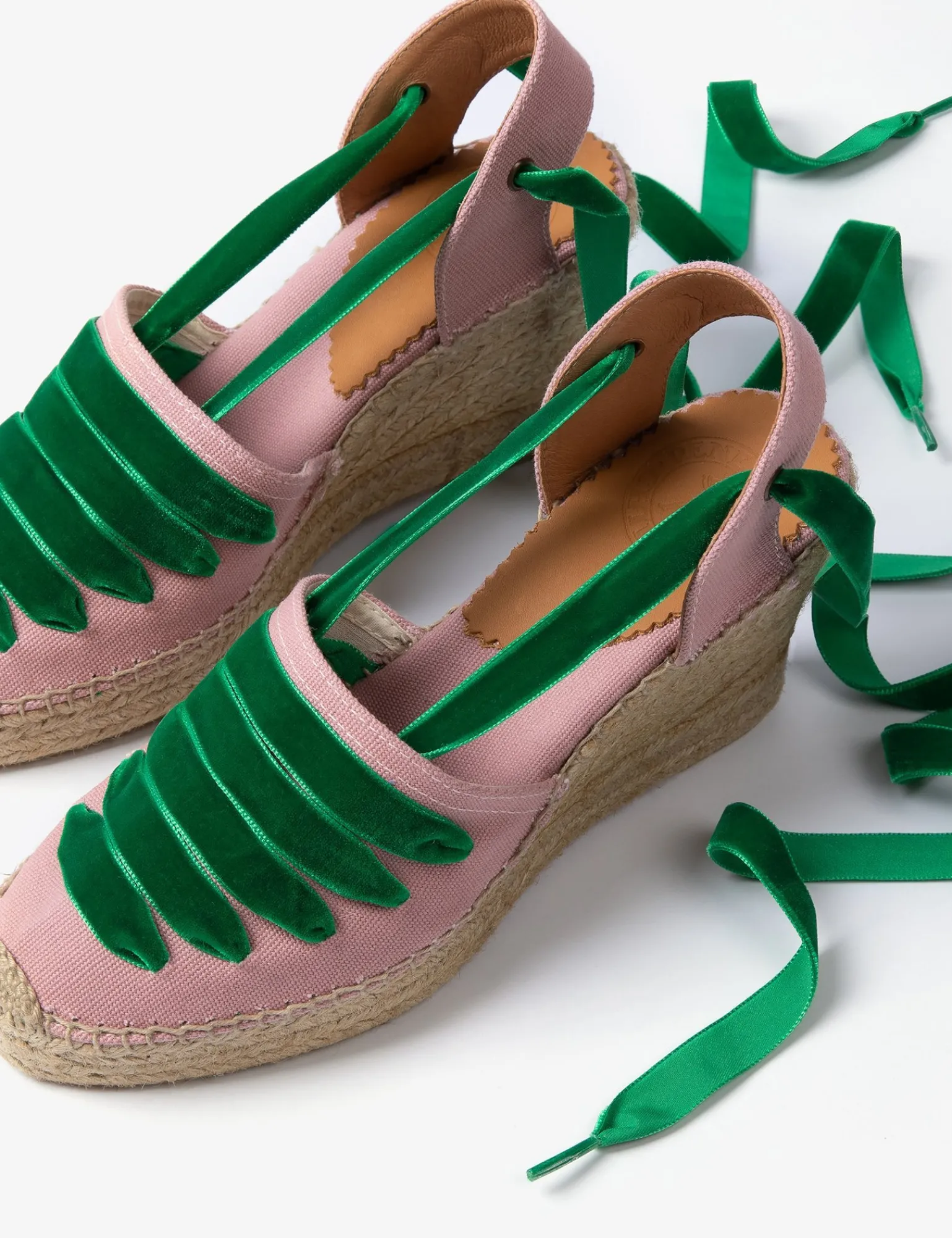 Designed on the same elegant wedge as our best-selling Scoop Espadrille, the High Sevillana Dali has the beautiful woven velvet ribbon work that is so distinctive of this story. Designed in this eye-catching pastel pink and rich green colourway, and authentically made for us by hand in Spain, the High Sevillana has a cotton canvas front and heel, in keeping with its rustic over stitching in jute thread.