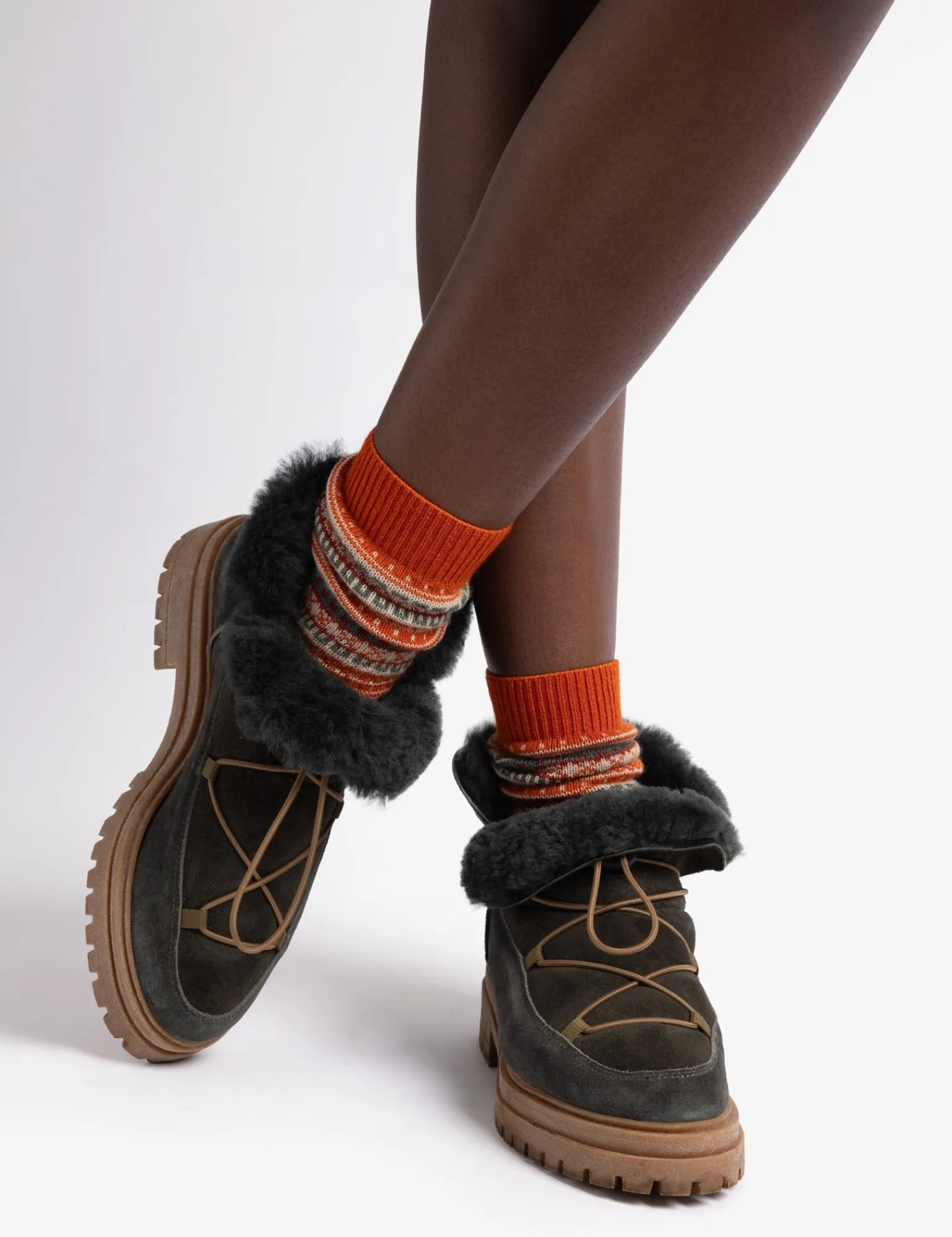 The Lomond is a brand-new style for us that sits within our winter range. A hiking inspired design, with an easy and functional elasticated fastening, alongside luxurious, handstitched, double-faced shearling cuffs. The Lomond is double-faced shearling-lined making it an incredibly cosy boot for the cold winter months. Thanks to its luxury look this boot would work perfectly with all styles from gym wear to chic city outfits – as well as being the perfect choice to take to the slopes!