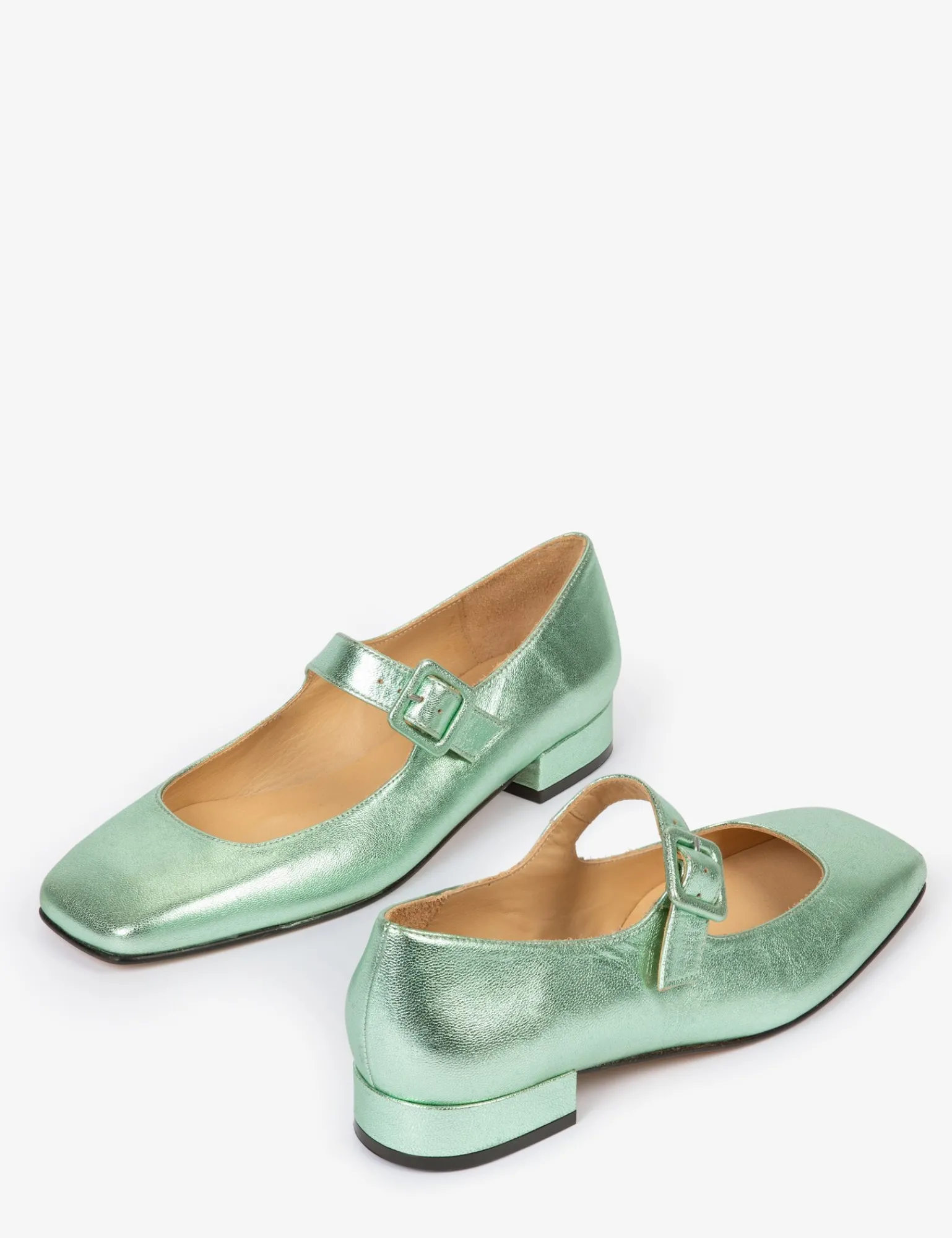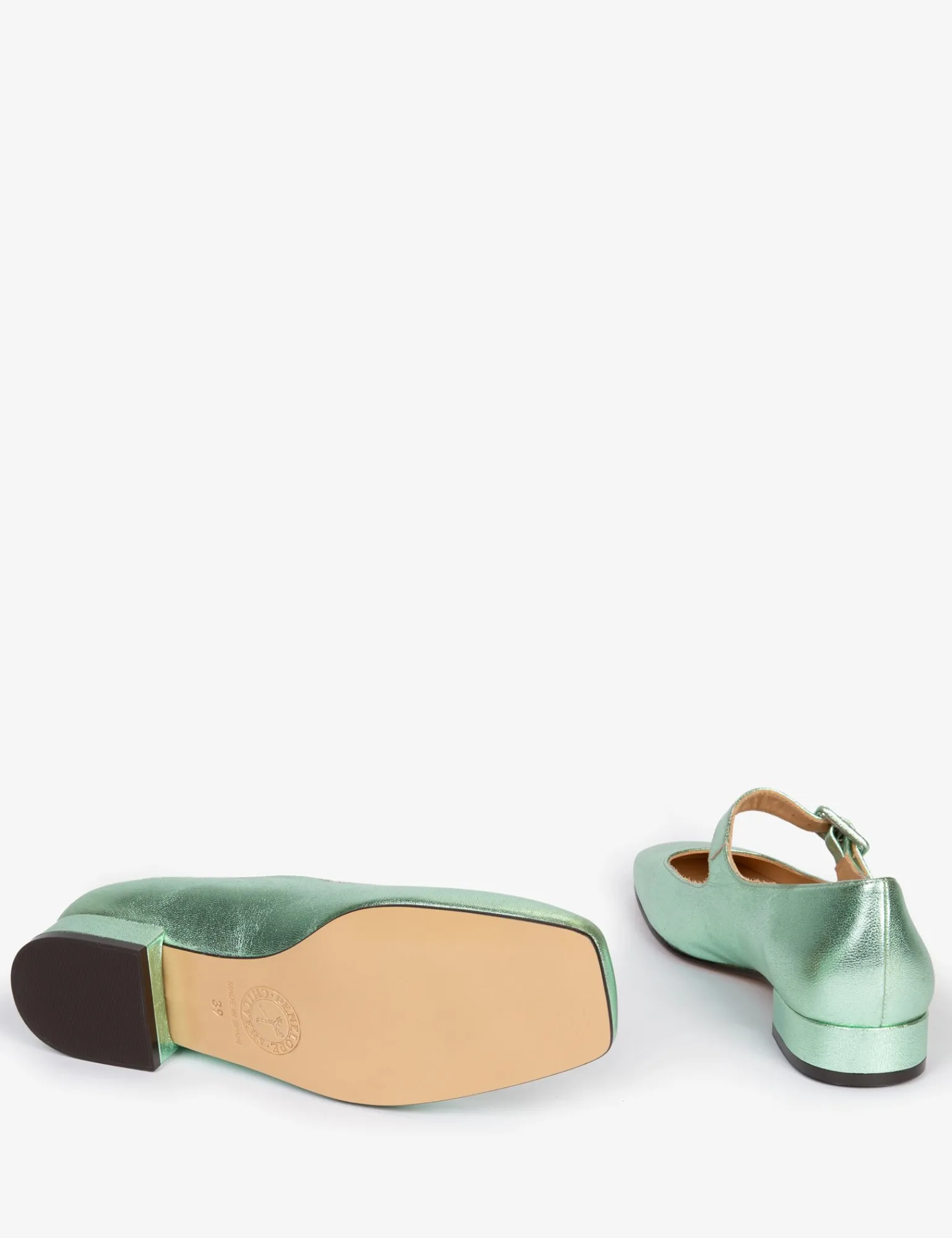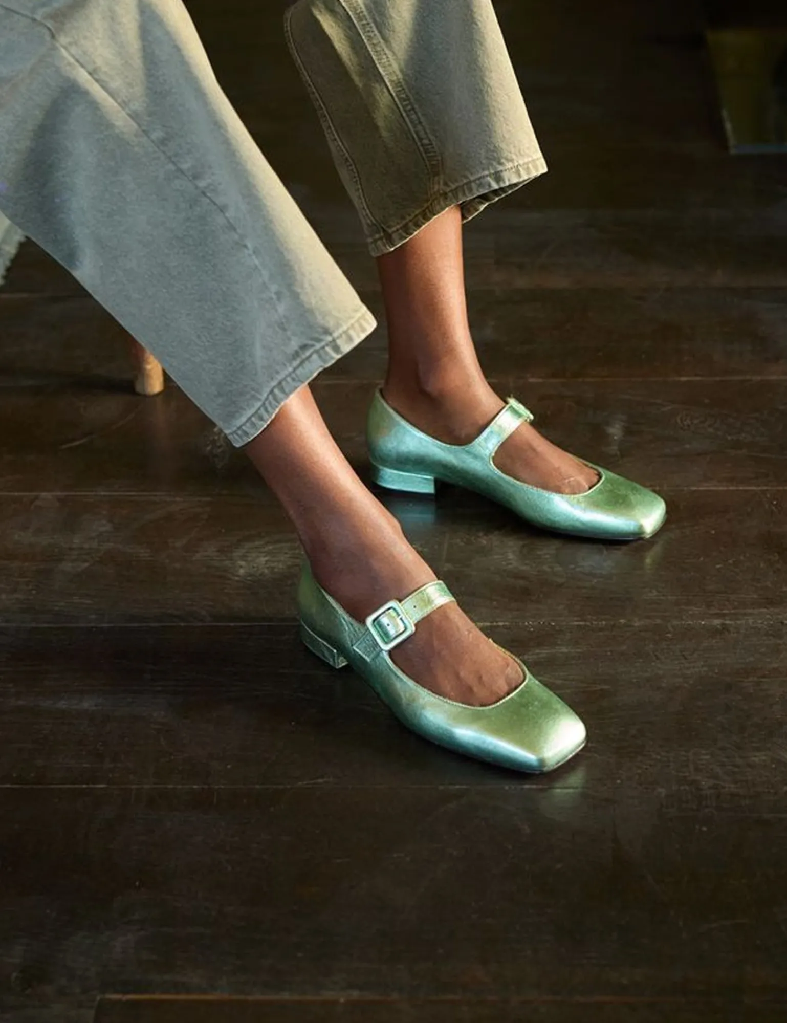 Our low-heeled Mary Jane epitomises quiet luxury. Designed in our signature, slim-fit Mary Jane style, and crafted from 100% leather, atop a leather sole. This subtle mint hue, in metallic leather is perfect for styling with autumnal colours for a transitional look. Pair these with jeans and bare feet for late summer and then add a fun pair of socks or tights once the colder weather comes.