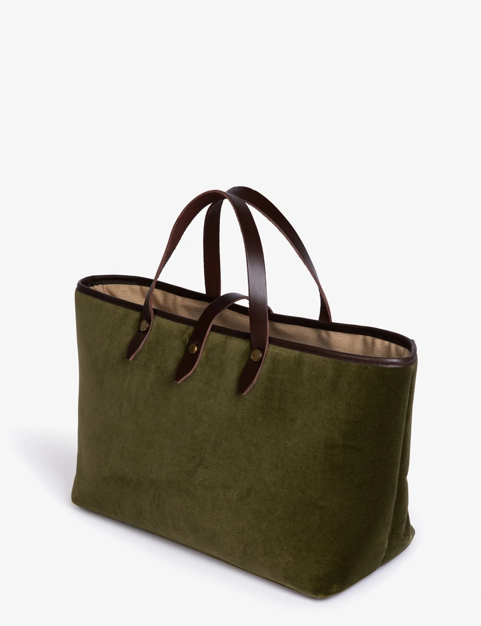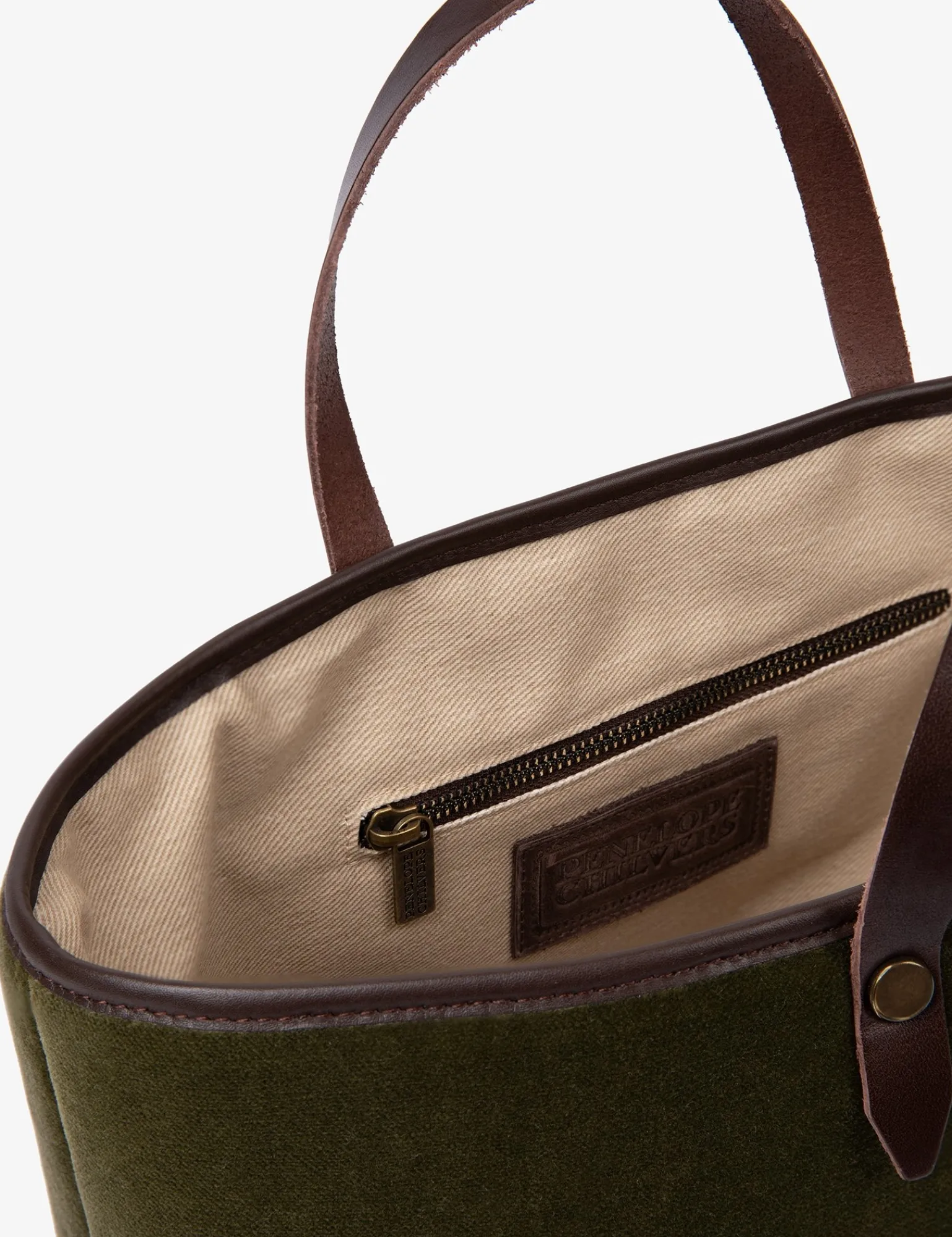 The Velvet Mini Tote is a masterclass in easy, everyday elegance. A great piece for wearing out and about in either the city or the countryside, this bag is handcrafted from our most hardwearing cotton velvet offered to you in a sumptuous Dark Oak, or this effortlessly elegant Khaki Green, a key colour for this season and beyond. The details are plentiful, and the craft is at every angle – there is a Sam Browne studded closure, set off with sturdy, studded leather handles. Inside features a secure, zip up inside pocket and is fulling lined in cotton twill.If you are in need of a sidekick that quietly elevates an outfit any day of the week, look no further than the Velvet Mini Tote Bag.