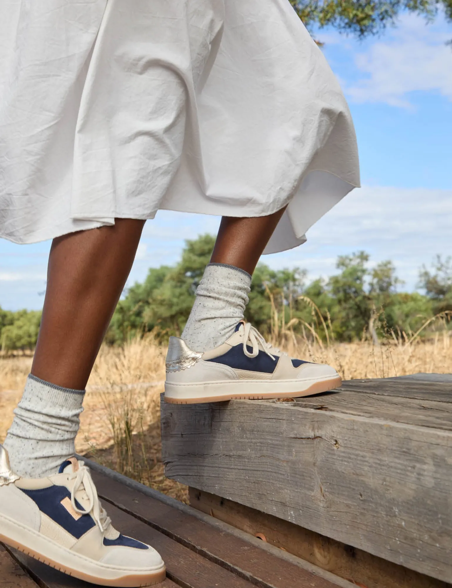 Our Pintado trainers are a great way to dip into the quiet luxury aesthetic. Chic enough to pop out for dinner in and comfortable enough to wear all day too! Available in 2 easy to wear colourways: sand/champagne or navy/white and featuring our signature scallop leather detailing on the heel, as seen on the much-loved Long Tassel Boot, this elevated everyday classic is just the right balance of pretty, with a touch of sportiness and an ideal wear all year-round piece!