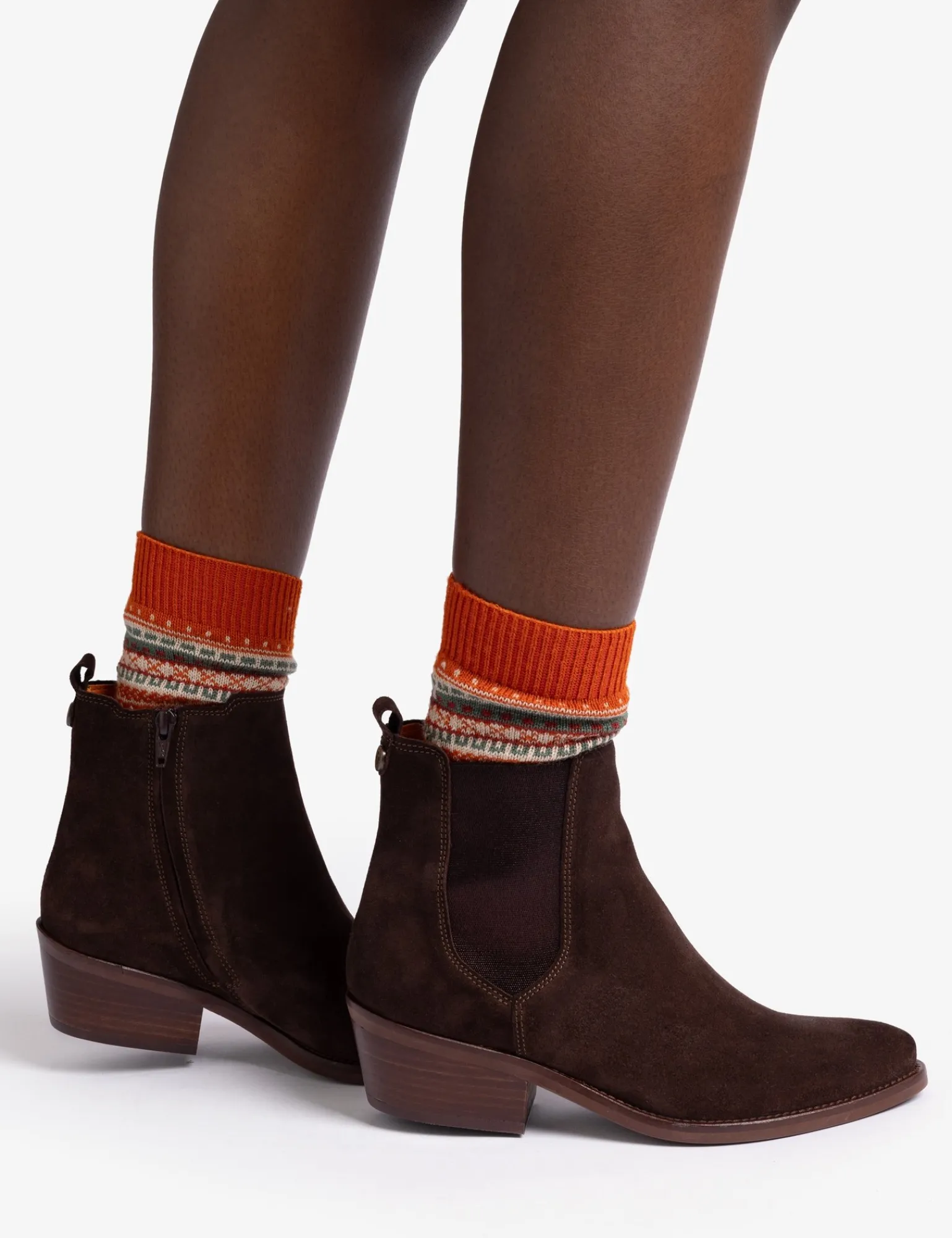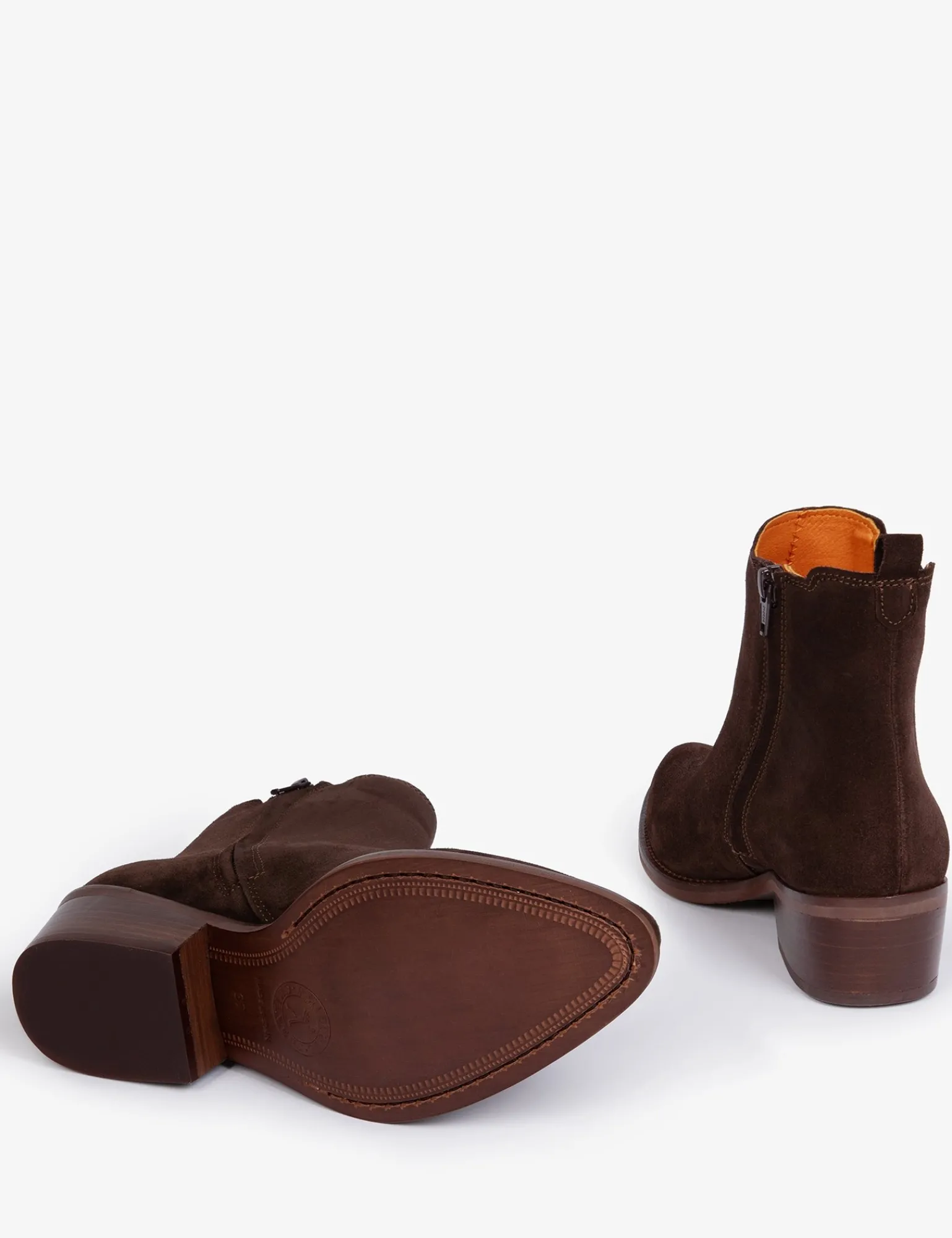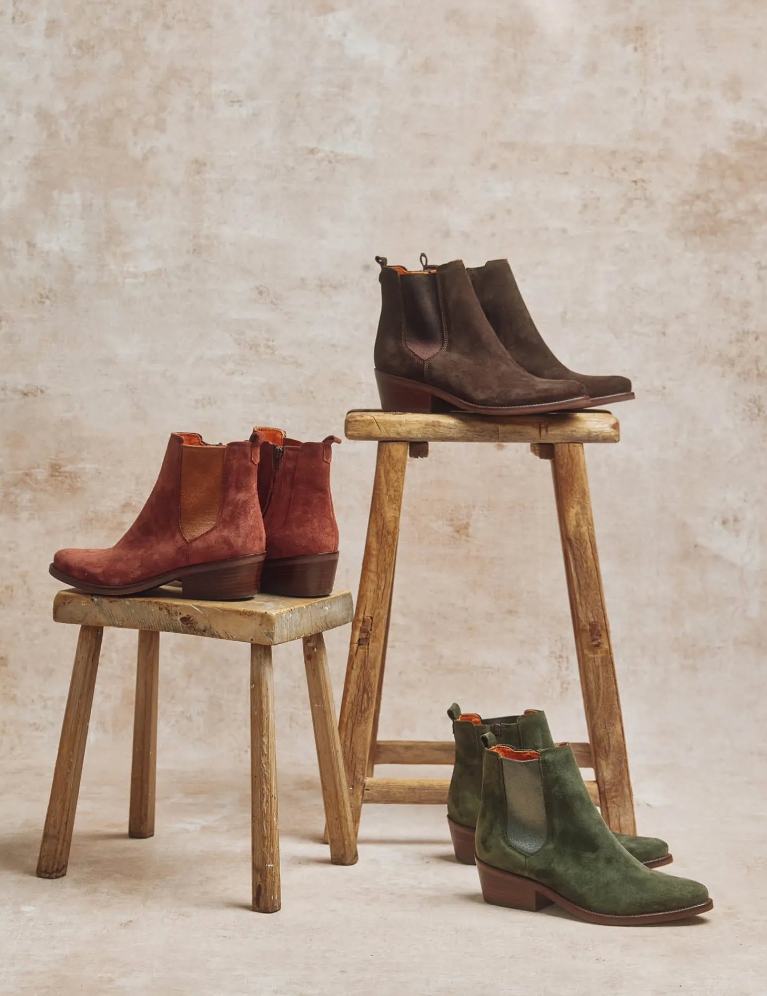Introducing the Rove, designed on the same last as our much-loved Cassidy style, this piece is a perfect office-to-dinner kind of style. Designed in a Bitter Chocolate suede and cropped to the ankle with a low Cuban heel, inside zip, and contrast satin metallic insert for that sprinkle of fun – the Rove is an investment in elegance and ease. A great boot for country life, a dinner party or days spent out and about roving the city!