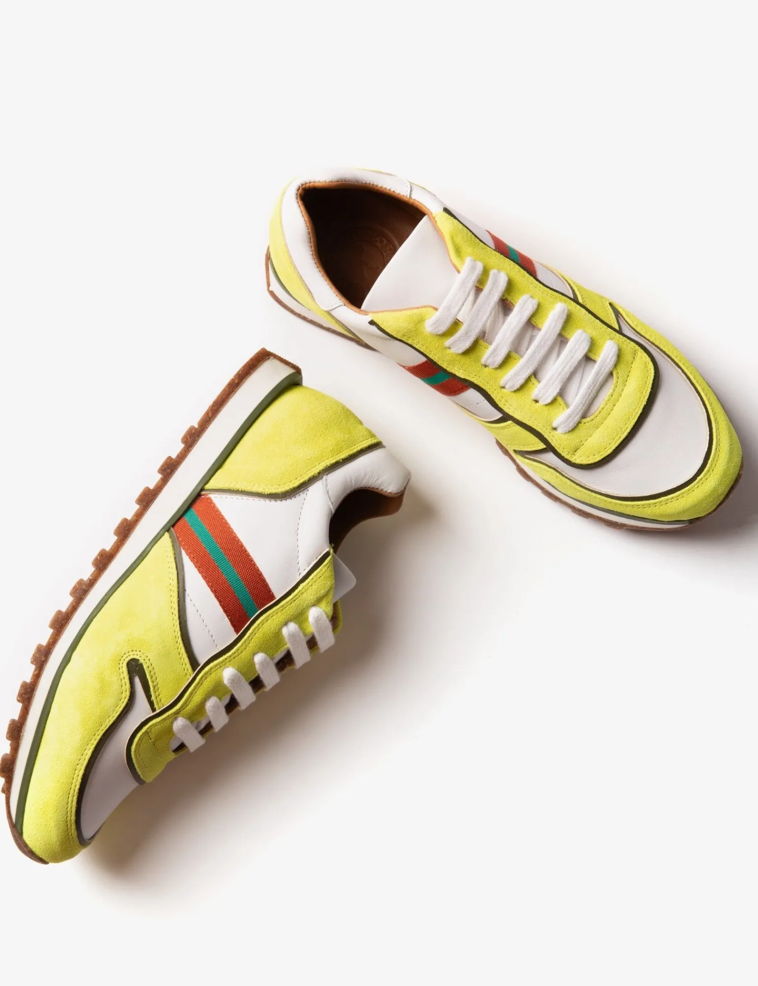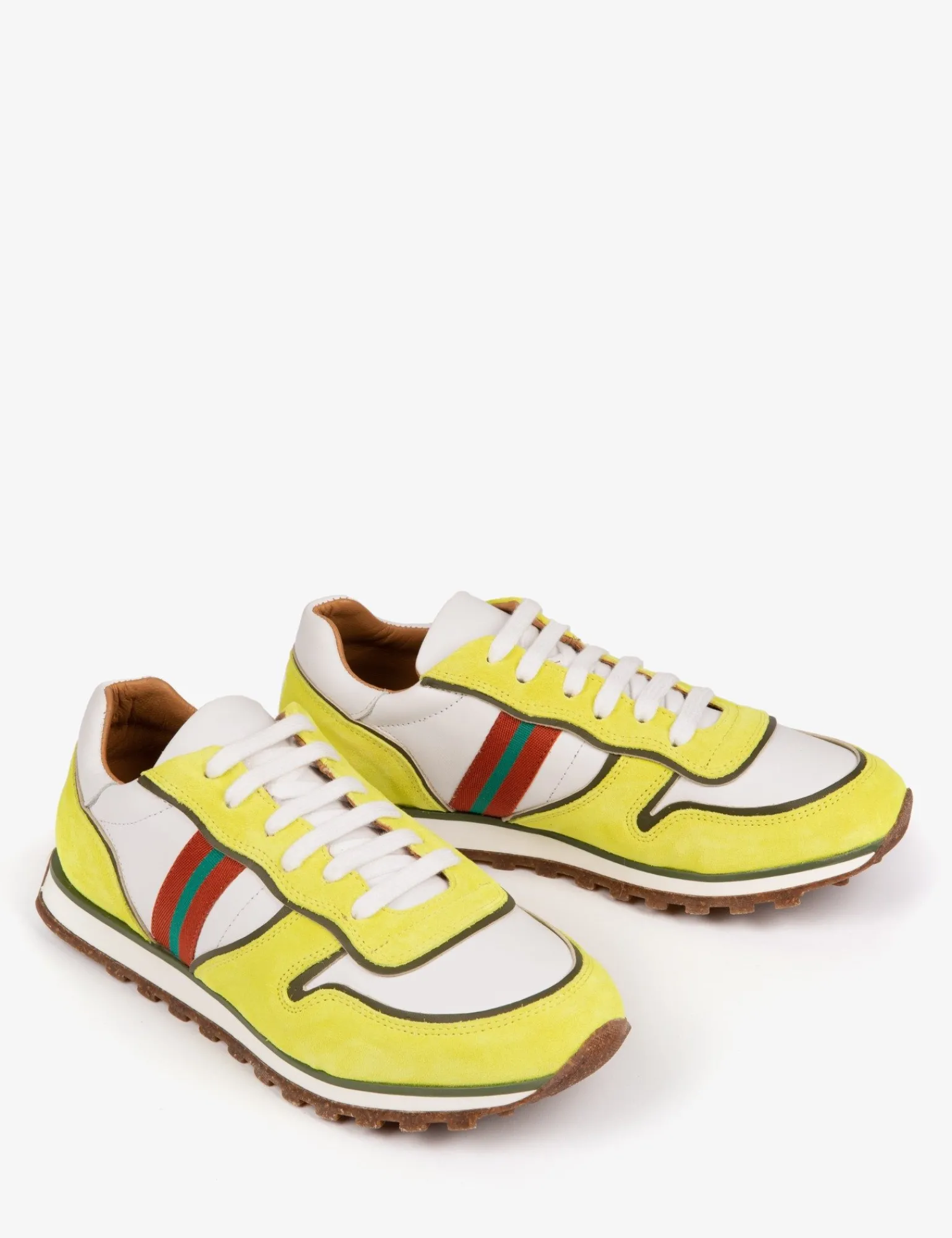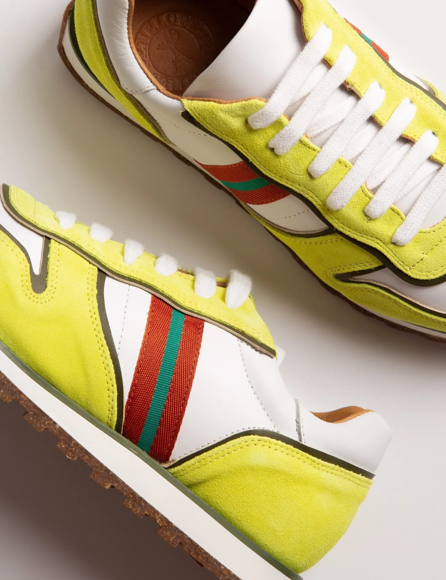 Re-energise your spring wardrobe with these new Studio Trainers, inspired by vintage sneakers with a slimmer silhouette and cleated sole. Pops of washed neon suede in yellow or pink overlay a smooth, white leather base with our distinctive branded stripe to finish. Fully calfskin lined with a soft, supportive insole and cork and rubber sole.