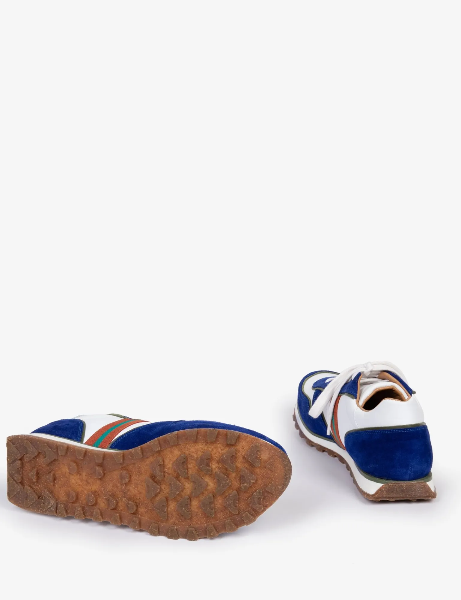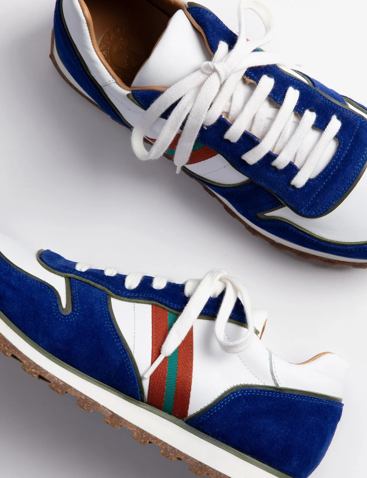 Re-energise your autumn wardrobe with our newest Studio Trainer styles, inspired by vintage sneakers with a slimmer silhouette and cleated sole. Pops of washed suede in either a cobalt blue or a casual tan, sit on top of a white leather base with our distinctive branded stripe to finish. Fully calfskin lined with a soft, supportive insole and cork and rubber sole.